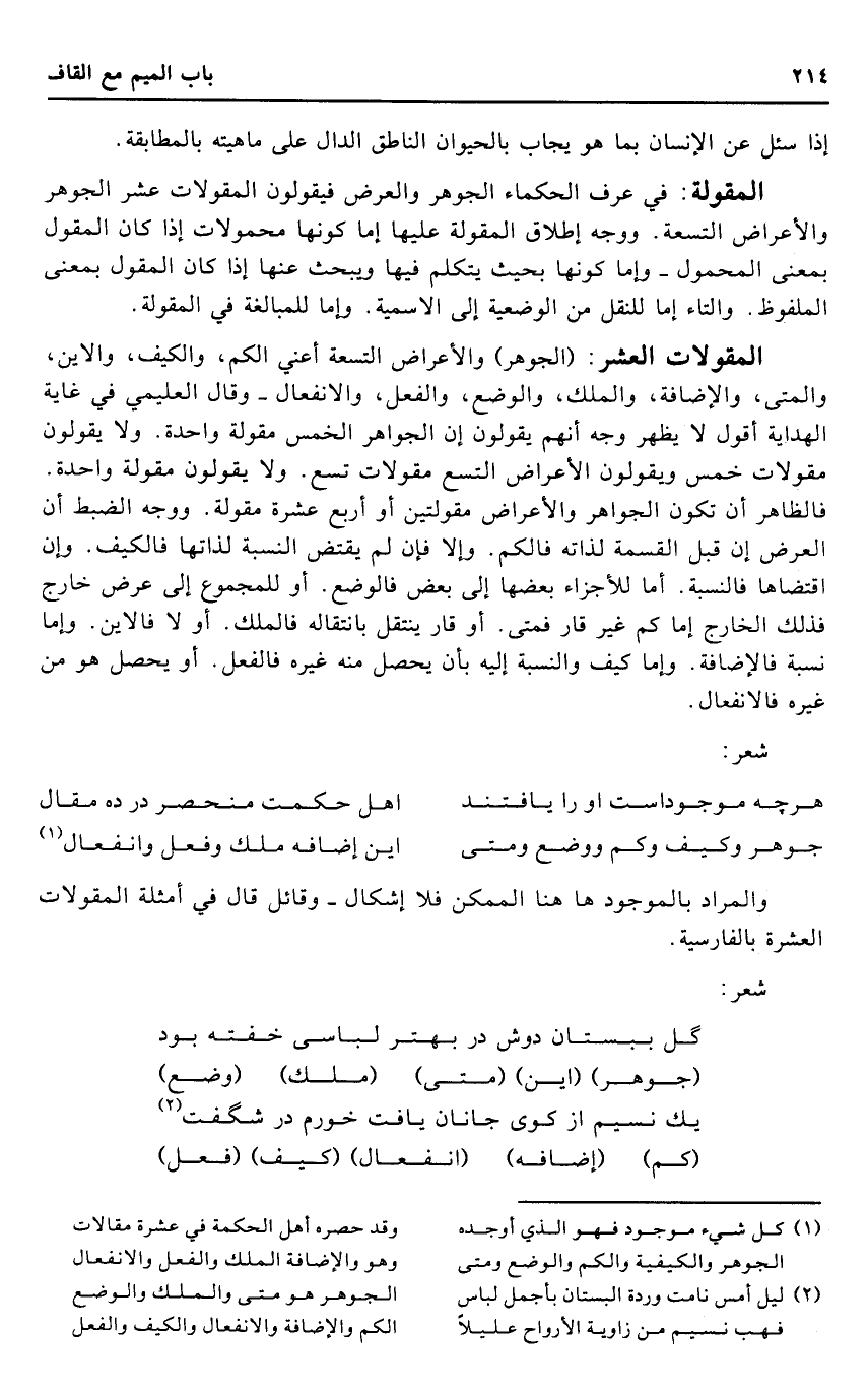 وَالْمرَاد بالموجود هَا هُنَا الْمُمكن فَلَا إِشْكَال - وَقَائِل قَالَ فِي أَمْثِلَة المقولات الْعشْرَة بِالْفَارِسِيَّةِ.