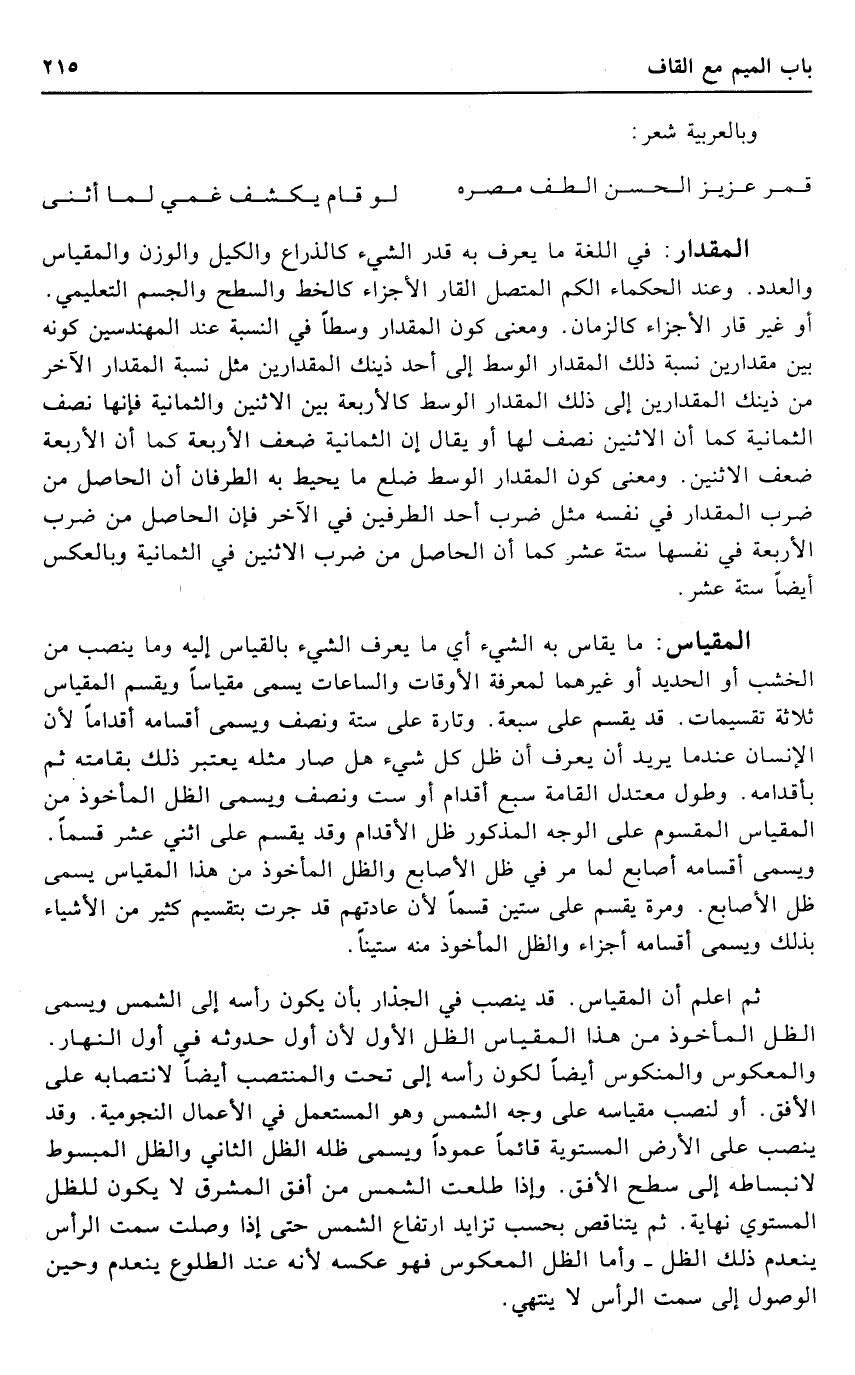 المقياس: مَا يُقَاس بِهِ الشَّيْء أَي مَا يعرف الشَّيْء بِالْقِيَاسِ إِلَيْهِ وَمَا ينصب من الْخشب أَو الْحَدِيد أَو غَيرهمَا لمعْرِفَة الْأَوْقَات والساعات يُسمى مقياسا وَيقسم المقياس ثَلَاثَة تقسيمات. قد يقسم على سَبْعَة. وَتارَة على سِتَّة وَنصف وَيُسمى أقسامه أقداما لِأَن الْإِنْسَان عِنْدَمَا يُرِيد أَن يعرف أَن ظلّ كل شَيْء هَل صَار مثله يعْتَبر ذَلِك بقامته ثمَّ بأقدامه. وَطول معتدل الْقَامَة سبع أَقْدَام أَو سِتّ وَنصف وَيُسمى الظل الْمَأْخُوذ من المقياس الْمَقْسُوم على الْوَجْه الْمَذْكُور ظلّ الْأَقْدَام وَقد يقسم على اثْنَي عشر قسما. وَيُسمى أقسامه أَصَابِع لما مر فِي ظلّ الْأَصَابِع والظل الْمَأْخُوذ من هَذَا المقياس يُسمى ظلّ الْأَصَابِع. وَمرَّة يقسم على سِتِّينَ قسما لِأَن عَادَتهم قد جرت بتقسيم كثير من الْأَشْيَاء بذلك وَيُسمى أقسامه أَجزَاء والظل الْمَأْخُوذ مِنْهُ ستينا.