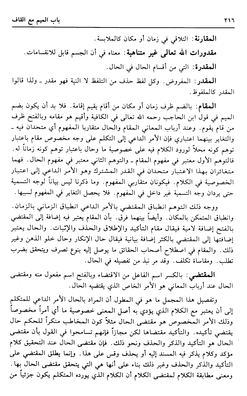 الْمقَام: بِالضَّمِّ ظرف زمَان أَو مَكَان من أَقَامَ يُقيم إِقَامَة. فَلَا بُد أَن يكون بِضَم الْمِيم فِي قَول ابْن الْحَاجِب رَحمَه الله تَعَالَى فِي الكافية وأقيم هُوَ مقَامه وبالفتح ظرف من قَامَ يقوم. وَعند أَرْبَاب الْمعَانِي الْمقَام وَالْحَال متقاربا الْمَفْهُوم أَي متحدان فِيهِ - والتغاير بَينهمَا اعتباري فَإِن الْأَمر الدَّاعِي إِلَى التَّكَلُّم على وَجه مَخْصُوص مقَام بِاعْتِبَار توهم كَونه محلا لوُرُود الْكَلَام فِيهِ على خُصُوصِيَّة مَا وَحَال بِاعْتِبَار توهم كَونه زَمَانا لَهُ. فالتوهم الأول مُعْتَبر فِي مَفْهُوم الْمقَام - والتوهم الثَّانِي مُعْتَبر فِي مَفْهُوم الْحَال. فهما متغائران بِهَذَا الِاعْتِبَار متحدان فِي الْقدر الْمُشْتَرك وَهُوَ الْأَمر الدَّاعِي إِلَى اعْتِبَار الخصوصية فِي الْكَلَام. فيكونان متقاربي الْمَفْهُوم. وَمَا ذكرنَا لَيْسَ بَيَانا لوجه التَّسْمِيَة حَتَّى يردان وَجه التَّسْمِيَة غير دَاخل فِي الْمَفْهُوم. فَلَا يحصل التغاير فِي الْمَفْهُوم لسببها.