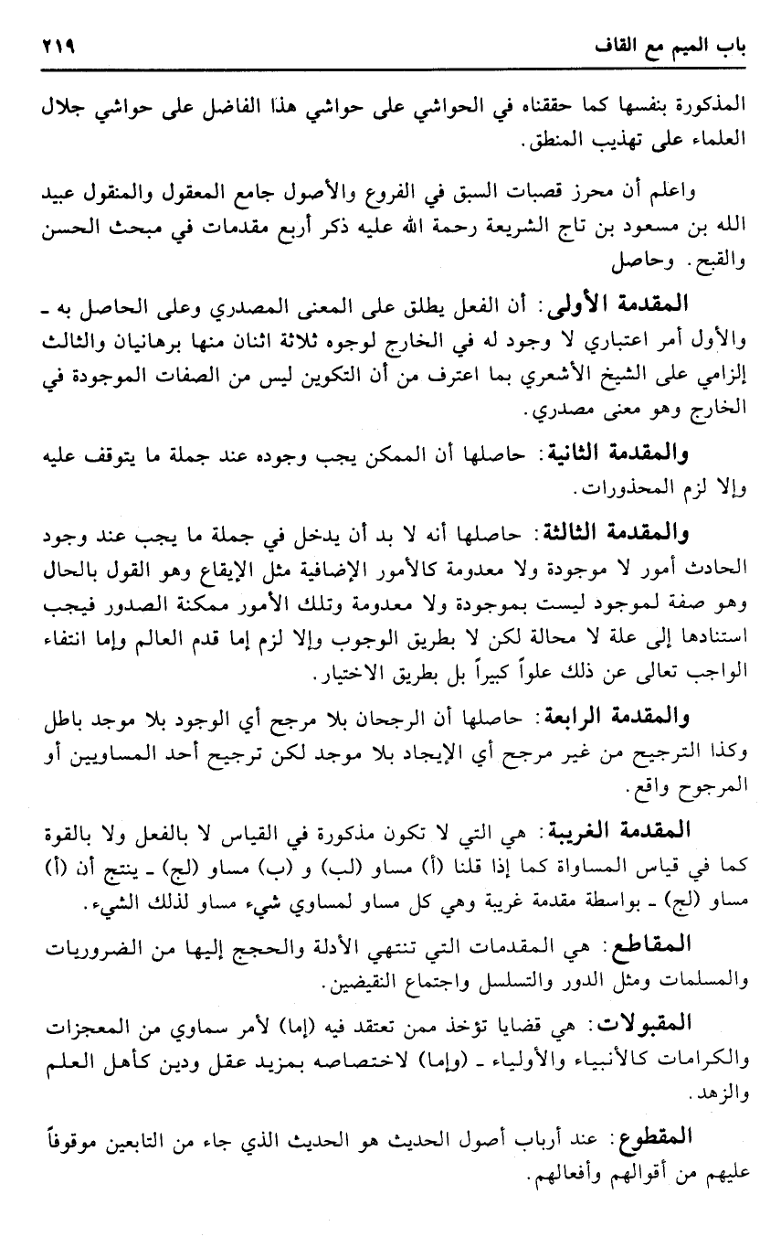 وَاعْلَم أَن مُحرز قصبات السَّبق فِي الْفُرُوع وَالْأُصُول جَامع الْمَعْقُول وَالْمَنْقُول عبيد الله بن مَسْعُود بن تَاج الشَّرِيعَة رَحْمَة الله عَلَيْهِ ذكر أَربع مُقَدمَات فِي مَبْحَث الْحسن والقبح. وَحَاصِل.