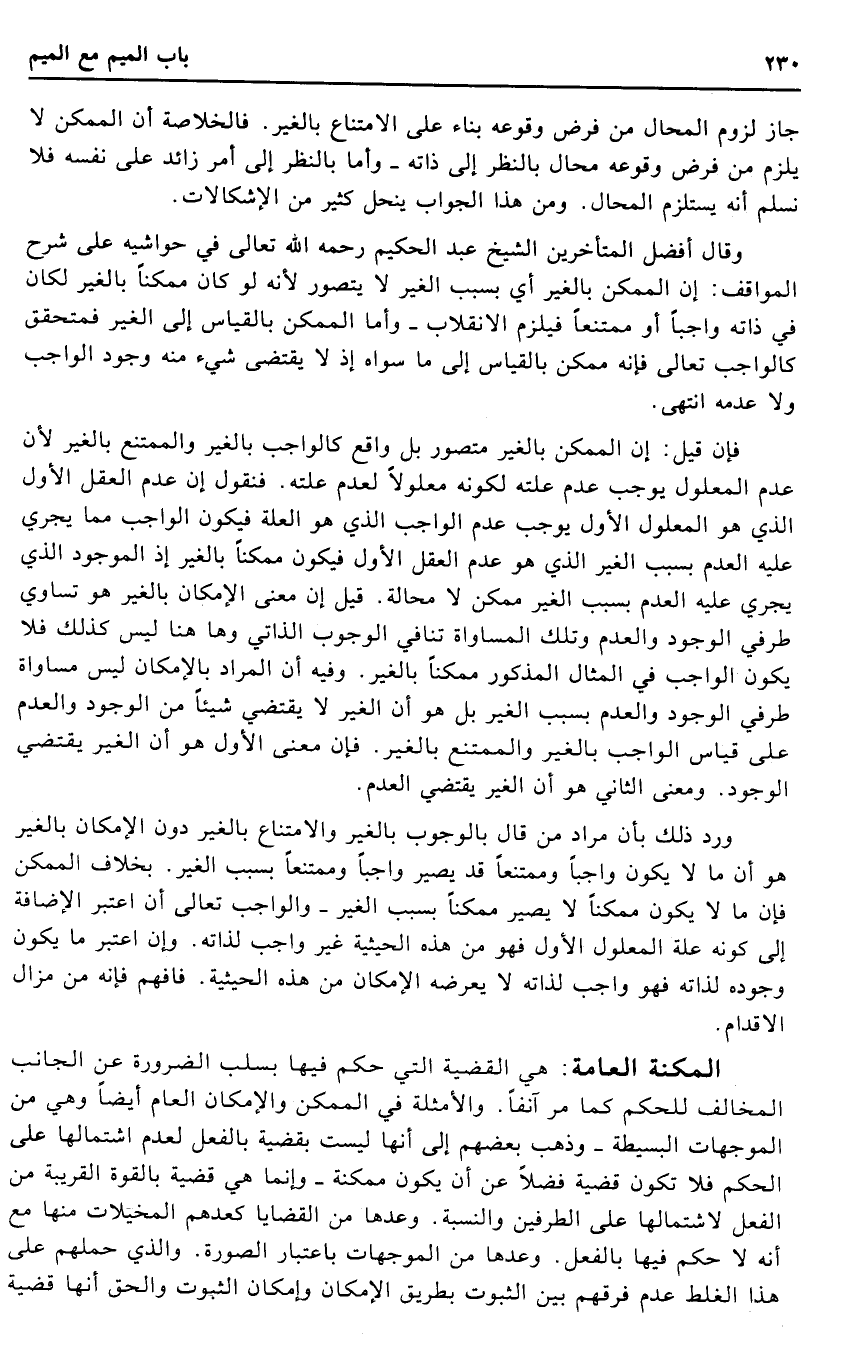 فَإِن قيل: إِن الْمُمكن بِالْغَيْر مُتَصَوّر بل وَاقع كالواجب بِالْغَيْر والممتنع بِالْغَيْر لِأَن عدم الْمَعْلُول يُوجب عدم علته لكَونه معلولا لعدم علته. فَنَقُول إِن عدم الْعقل الأول الَّذِي هُوَ الْمَعْلُول الأول يُوجب عدم الْوَاجِب الَّذِي هُوَ الْعلَّة فَيكون الْوَاجِب مِمَّا يجْرِي عَلَيْهِ الْعَدَم بِسَبَب الْغَيْر الَّذِي هُوَ عدم الْعقل الأول فَيكون مُمكنا بِالْغَيْر إِذْ الْمَوْجُود الَّذِي يجْرِي عَلَيْهِ الْعَدَم بِسَبَب الْغَيْر مُمكن لَا محَالة. قيل إِن معنى الْإِمْكَان بِالْغَيْر هُوَ تَسَاوِي طرفِي الْوُجُود والعدم وَتلك الْمُسَاوَاة تنَافِي الْوُجُوب الذاتي وَهَا هُنَا لَيْسَ كَذَلِك فَلَا يكون الْوَاجِب فِي الْمِثَال الْمَذْكُور مُمكنا بِالْغَيْر. وَفِيه أَن المُرَاد بالإمكان لَيْسَ مُسَاوَاة طرفِي الْوُجُود والعدم بِسَبَب الْغَيْر بل هُوَ أَن الْغَيْر لَا يَقْتَضِي شَيْئا من الْوُجُود والعدم على قِيَاس الْوَاجِب بِالْغَيْر والممتنع بِالْغَيْر. فَإِن معنى الأول هُوَ أَن الْغَيْر يَقْتَضِي الْوُجُود. وَمعنى الثَّانِي هُوَ أَن الْغَيْر يَقْتَضِي الْعَدَم.