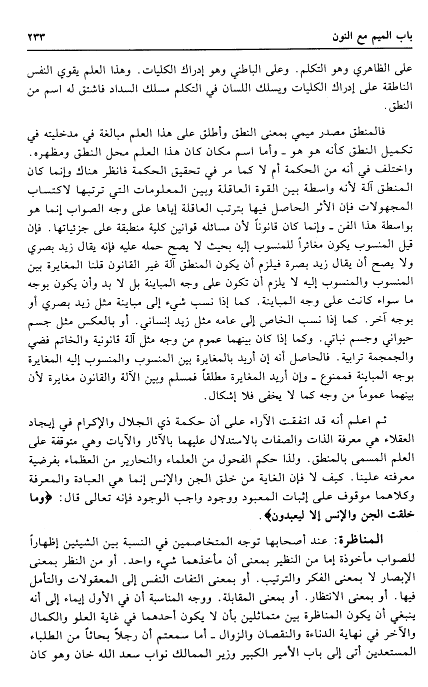 ثمَّ اعْلَم أَنه قد اتّفقت الآراء على أَن حِكْمَة ذِي الْجلَال وَالْإِكْرَام فِي إِيجَاد الْعُقَلَاء هِيَ معرفَة الذَّات وَالصِّفَات بالاستدلال عَلَيْهِمَا بالآثار والآيات وَهِي متوقفة على الْعلم الْمُسَمّى بالْمَنْطق. وَلذَا حكم الفحول من الْعلمَاء والنحارير من العظماء بفرضية مَعْرفَته علينا. كَيفَ لَا فَإِن الْغَايَة من خلق الْجِنّ وَالْإِنْس إِنَّمَا هِيَ الْعِبَادَة والمعرفة وَكِلَاهُمَا مَوْقُوف على إِثْبَات المعبود وَوُجُود وَاجِب الْوُجُود فَإِنَّهُ تَعَالَى قَالَ: {وَمَا خلقت الْجِنّ وَالْإِنْس إِلَّا ليعبدون} .