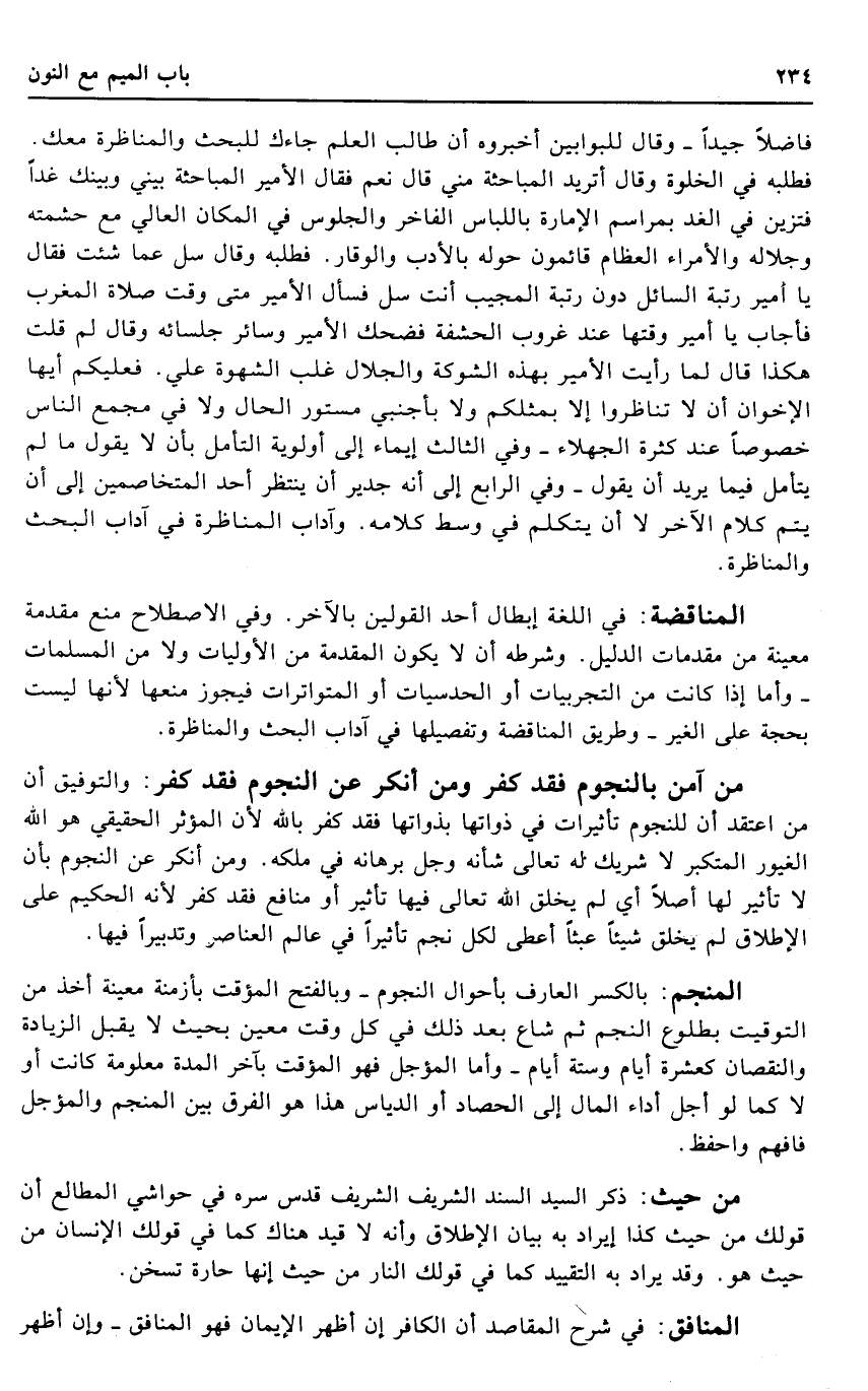 فَاضلا جيدا - وَقَالَ للبوابين أَخْبرُوهُ أَن طَالب الْعلم جَاءَك للبحث والمناظرة مَعَك. فَطَلَبه فِي الْخلْوَة وَقَالَ أَتُرِيدُ المباحثة مني قَالَ نعم فَقَالَ الْأَمِير المباحثة بيني وَبَيْنك غَدا فتزين فِي الْغَد بمراسم الْإِمَارَة باللباس الفاخر وَالْجُلُوس فِي الْمَكَان العالي مَعَ حشمته وجلاله والأمراء الْعِظَام قائمون حوله بالأدب وَالْوَقار. فَطَلَبه وَقَالَ سل عَمَّا شِئْت فَقَالَ يَا أَمِير رُتْبَة السَّائِل دون رُتْبَة الْمُجيب أَنْت سل فَسَأَلَ الْأَمِير مَتى وَقت صَلَاة الْمغرب فَأجَاب يَا أَمِير وَقتهَا عِنْد غرُوب الْحَشَفَة فَضَحِك الْأَمِير وَسَائِر جُلَسَائِهِ وَقَالَ لم قلت هَكَذَا قَالَ لما رَأَيْت الْأَمِير بِهَذِهِ الشَّوْكَة والجلال غلب الشَّهْوَة عَليّ. فعلكيم أَيهَا الإخوان أَن لَا تنَاظرُوا إِلَّا بمثلكم وَلَا بأجنبي مَسْتُور الْحَال وَلَا فِي مجمع النَّاس خُصُوصا عِنْد كَثْرَة الجهلاء - وَفِي الثَّالِث إِيمَاء إِلَى أَوْلَوِيَّة التَّأَمُّل بِأَن لَا يَقُول مَا لم يتَأَمَّل فِيمَا يُرِيد أَن يَقُول - وَفِي الرَّابِع إِلَى أَنه جدير أَن ينْتَظر أحد المتخاصمين إِلَى أَن يتم كَلَام الآخر لَا أَن يتَكَلَّم فِي وسط كَلَامه. وآداب المناظرة فِي آدَاب الْبَحْث والمناظرة.