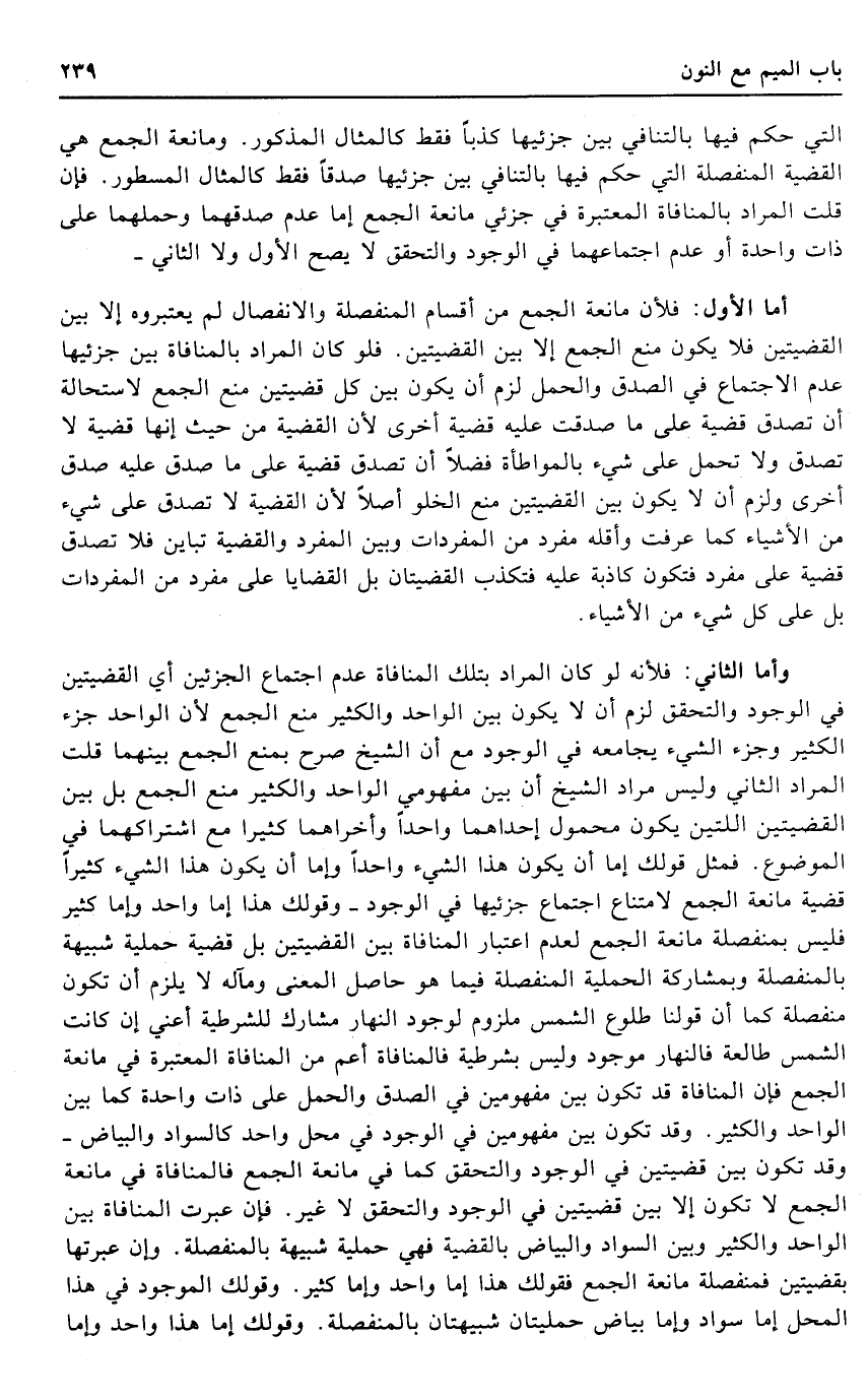 وَأما الثَّانِي: فَلِأَنَّهُ لَو كَانَ المُرَاد بِتِلْكَ الْمُنَافَاة عدم اجْتِمَاع الجزئين أَي القضيتين فِي الْوُجُود والتحقق لزم أَن لَا يكون بَين الْوَاحِد وَالْكثير منع الْجمع لِأَن الْوَاحِد جُزْء الْكثير وجزء الشَّيْء يجامعه فِي الْوُجُود مَعَ أَن الشَّيْخ صرح بِمَنْع الْجمع بَينهمَا قلت المُرَاد الثَّانِي وَلَيْسَ مُرَاد الشَّيْخ أَن بَين مفهومي الْوَاحِد وَالْكثير منع الْجمع بل بَين القضيتين اللَّتَيْنِ يكون مَحْمُول إِحْدَاهمَا وَاحِدًا وأخراهما كثيرا مَعَ اشتراكهما فِي الْمَوْضُوع. فَمثل قَوْلك إِمَّا أَن يكون هَذَا الشَّيْء وَاحِدًا وَإِمَّا أَن يكون هَذَا الشَّيْء كثيرا قَضِيَّة مَانِعَة الْجمع لِامْتِنَاع اجْتِمَاع جزئيها فِي الْوُجُود - وقولك هَذَا إِمَّا وَاحِد وَإِمَّا كثير فَلَيْسَ بمنفصلة مَانِعَة الْجمع لعدم اعْتِبَار الْمُنَافَاة بَين القضيتين بل قَضِيَّة حملية شَبيهَة بالمنفصلة وبمشاركة الحملية الْمُنْفَصِلَة فِيمَا هُوَ حَاصِل الْمَعْنى ومآله لَا يلْزم أَن تكون مُنْفَصِلَة كَمَا أَن قَوْلنَا طُلُوع الشَّمْس ملزوم لوُجُود النَّهَار مشارك للشرطية أَعنِي إِن كَانَت الشَّمْس طالعة فالنهار مَوْجُود وَلَيْسَ بشرطية فالمنافاة أَعم من الْمُنَافَاة الْمُعْتَبرَة فِي مَانِعَة الْجمع فَإِن الْمُنَافَاة قد تكون بَين مفهومين فِي الصدْق وَالْحمل على ذَات وَاحِدَة كَمَا بَين الْوَاحِد وَالْكثير. وَقد تكون بَين مفهومين فِي الْوُجُود فِي مَحل وَاحِد كالسواد وَالْبَيَاض - وَقد تكون بَين قضيتين فِي الْوُجُود والتحقق كَمَا فِي مَانِعَة الْجمع فالمنافاة فِي مَانِعَة الْجمع لَا تكون إِلَّا بَين قضيتين فِي الْوُجُود والتحقق لَا غير. فَإِن عبرت الْمُنَافَاة بَين الْوَاحِد وَالْكثير وَبَين السوَاد وَالْبَيَاض بالقضية فَهِيَ حملية شَبيهَة بالمنفصلة. وَإِن عبرتها بقضيتين فمنفصلة مَانِعَة الْجمع فقولك هَذَا إِمَّا وَاحِد وَإِمَّا كثير. وقولك الْمَوْجُود فِي هَذَا الْمحل إِمَّا سَواد وَإِمَّا بَيَاض حمليتان شبيهتان بالمنفصلة. وقولك إِمَّا هَذَا وَاحِد وَإِمَّا