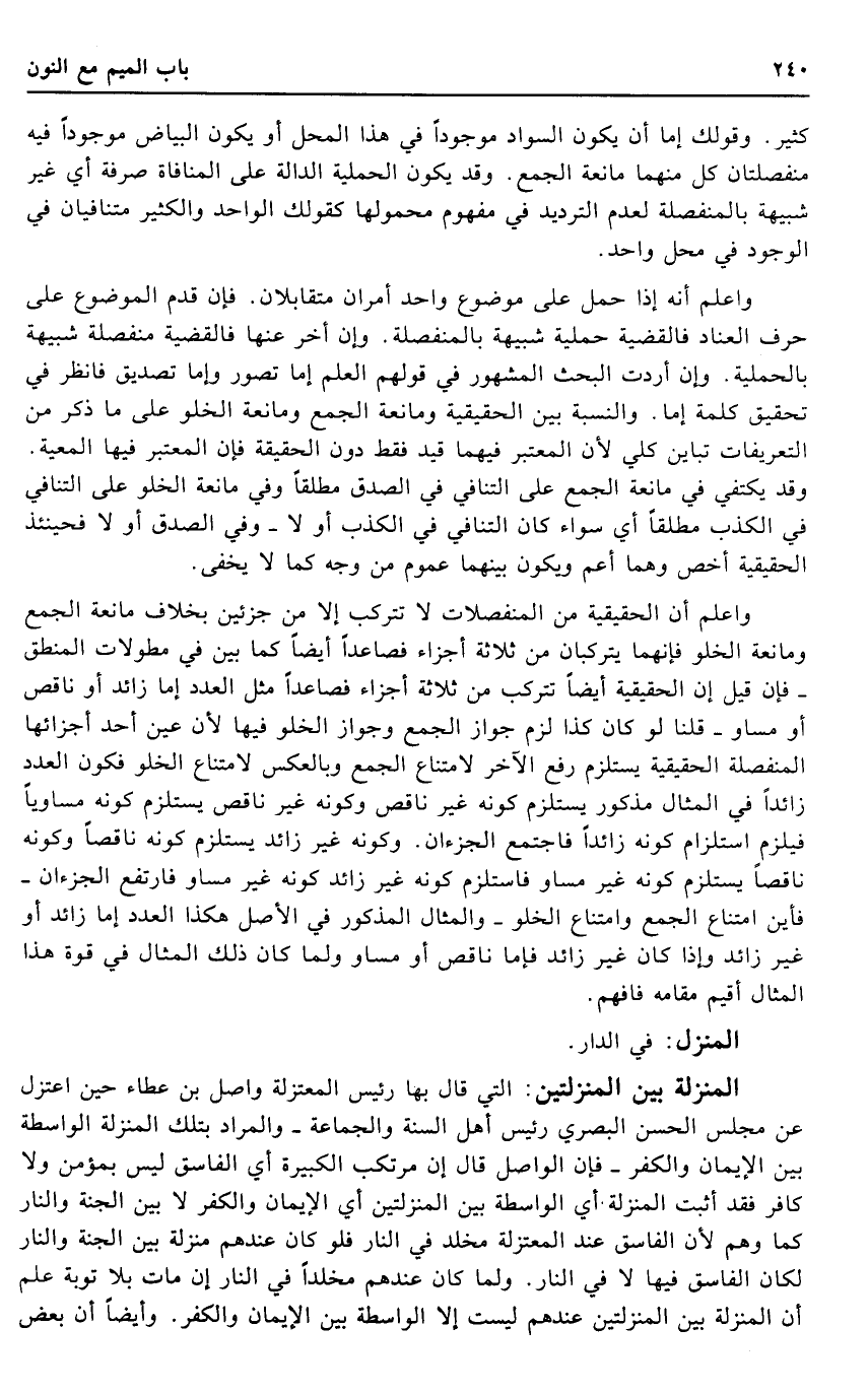 الْمنزلَة بَين المنزلتين: الَّتِي قَالَ بهَا رَئِيس الْمُعْتَزلَة وَاصل بن عَطاء حِين اعتزل عَن مجْلِس الْحسن الْبَصْرِيّ رَئِيس أهل السّنة وَالْجَمَاعَة - وَالْمرَاد بِتِلْكَ الْمنزلَة الْوَاسِطَة بَين الْإِيمَان وَالْكفْر - فَإِن الْوَاصِل قَالَ إِن مرتكب الْكَبِيرَة أَي الْفَاسِق لَيْسَ بِمُؤْمِن وَلَا كَافِر فقد أثبت الْمنزلَة أَي الْوَاسِطَة بَين المنزلتين أَي الْإِيمَان وَالْكفْر لَا بَين الْجنَّة وَالنَّار كَمَا وهم لِأَن الْفَاسِق عِنْد الْمُعْتَزلَة مخلد فِي النَّار فَلَو كَانَ عِنْدهم منزلَة بَين الْجنَّة وَالنَّار لَكَانَ الْفَاسِق فِيهَا لَا فِي النَّار. وَلما كَانَ عِنْدهم مخلدا فِي النَّار إِن مَاتَ بِلَا تَوْبَة علم أَن الْمنزلَة بَين المنزلتين عِنْدهم لَيست إِلَّا الْوَاسِطَة بَين الْإِيمَان وَالْكفْر. وَأَيْضًا أَن بعض