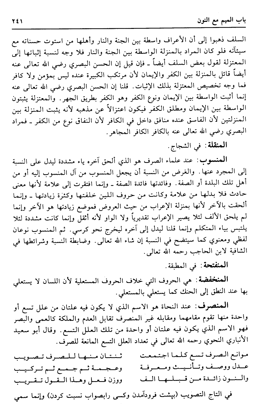 السّلف ذَهَبُوا إِلَى أَن الاعراف وَاسِطَة بَين الْجنَّة وَالنَّار وَأَهْلهَا من اسْتَوَت حَسَنَاته مَعَ سيئآته فَلَو كَانَ المُرَاد بالمنزلة الْوَاسِطَة بَين الْجنَّة وَالنَّار فَلَا وَجه لنسبة إِثْبَاتهَا إِلَى الْمُعْتَزلَة لقَوْل بعض السّلف أَيْضا - فَإِن قيل إِن الْحسن الْبَصْرِيّ رَضِي الله تَعَالَى عَنهُ أَيْضا قَائِل بالمنزلة بَين الْكفْر وَالْإِيمَان لِأَن مرتكب الْكَبِيرَة عِنْده لَيْسَ بِمُؤْمِن وَلَا كَافِر فَمَا وَجه تَخْصِيص الْمُعْتَزلَة بذلك الْإِثْبَات. قُلْنَا إِن الْحسن الْبَصْرِيّ رَضِي الله تَعَالَى عَنهُ إِنَّمَا أثبت الْوَاسِطَة بَين الْإِيمَان وَنَوع الْكفْر وَهُوَ الْكفْر بطرِيق الْجَهْر. والمعتزلة يثبتون الْوَاسِطَة بَين الْإِيمَان وَمُطلق الْكفْر فَيكون اعتزالا عَن مذْهبه لِأَنَّهُ يثبت الْمنزلَة بَين المنزلتين لِأَن الْفَاسِق عِنْده مُنَافِق دَاخل فِي الْكَافِر لِأَن النِّفَاق نوع من الْكفْر - فمراد الْبَصْرِيّ رَضِي الله تَعَالَى عَنهُ بالكافر الْكَافِر المجاهر.