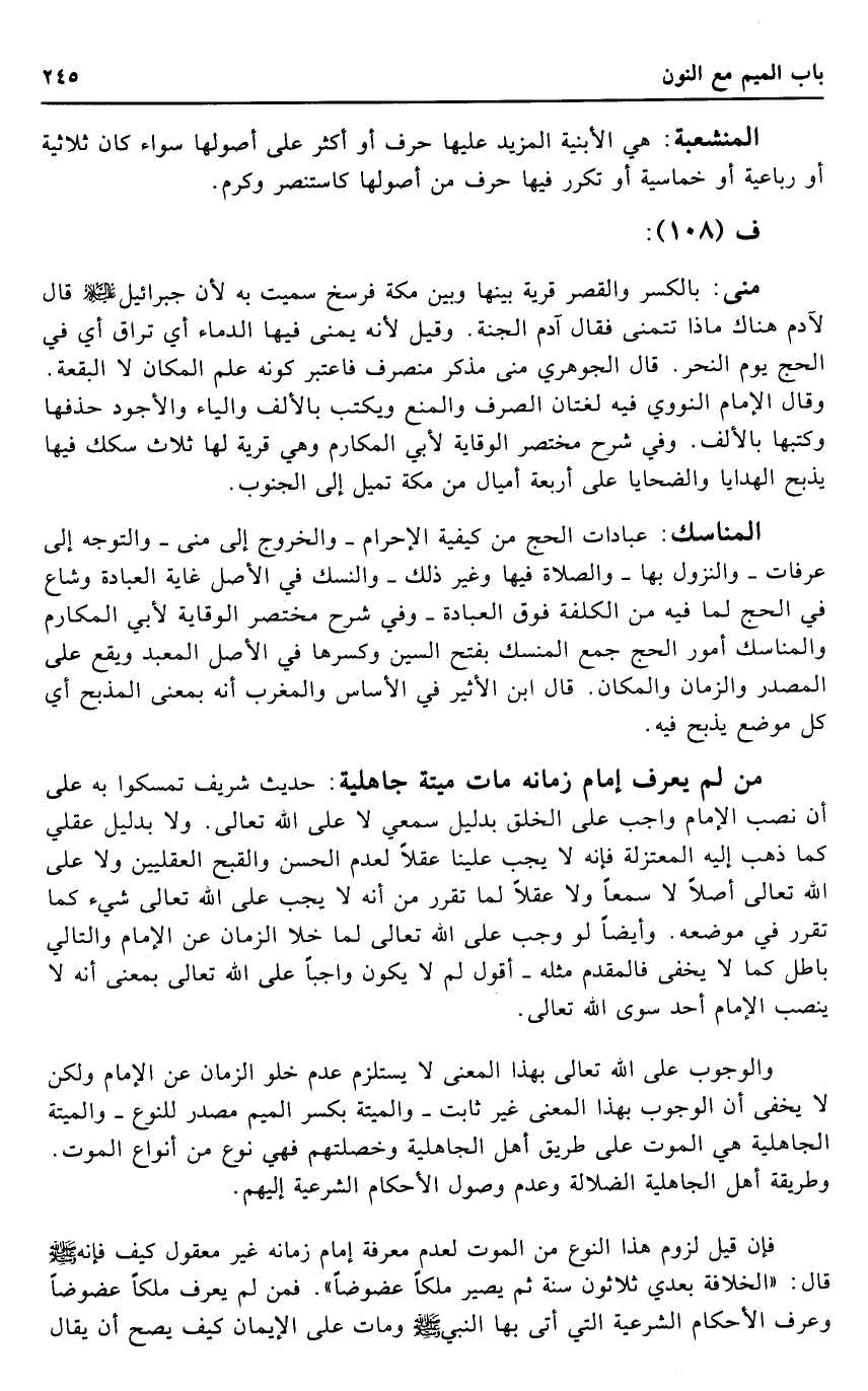 وَالْوُجُوب على الله تَعَالَى بِهَذَا الْمَعْنى لَا يسْتَلْزم عدم خلو الزَّمَان عَن الإِمَام وَلَكِن لَا يخفى أَن الْوُجُوب بِهَذَا الْمَعْنى غير ثَابت - وَالْميتَة بِكَسْر الْمِيم مصدر للنوع - وَالْميتَة الْجَاهِلِيَّة هِيَ الْمَوْت على طَرِيق أهل الْجَاهِلِيَّة وخصلتهم فَهِيَ نوع من أَنْوَاع الْمَوْت. وَطَرِيقَة أهل الْجَاهِلِيَّة الضَّلَالَة وَعدم وُصُول الْأَحْكَام الشَّرْعِيَّة إِلَيْهِم.