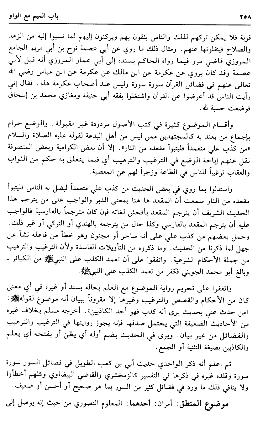 وَاسْتَدَلُّوا بِمَا رُوِيَ فِي بعض الحَدِيث من كذب عَليّ مُتَعَمدا ليضل بِهِ النَّاس فَليَتَبَوَّأ مَقْعَده من النَّار سَمِعت أَن المقعد هَا هُنَا بِمَعْنى الدبر وَالْوَاجِب على من يترجم هَذَا الحَدِيث الشريف أَن يترجم المقعد بأفحش لغاته فَإِن كَانَ مترجما بِالْفَارِسِيَّةِ فَالْوَاجِب عَلَيْهِ أَن يترجم المقعد بالفارسي وَكَذَا حَال من يترجمه بالهندي أَو التركي أَو غير ذَلِك. وَحمل بَعضهم من كذب عَليّ على أَنه سَاحر أَو مَجْنُون وَهُوَ خطأ من فَاعله نَشأ عَن جهل لما ذكرنَا من الحَدِيث. وَمَا ذَكرُوهُ من التأويلات الْفَاسِدَة وَلِأَن التَّرْغِيب والترهيب من جملَة الْأَحْكَام الشَّرْعِيَّة وَاتَّفَقُوا على أَن تعمد الْكَذِب على النَّبِي - صَلَّى اللَّهُ عَلَيْهِ وَسَلَّم َ - من الْكَبَائِر - وَبَالغ أَبُو مُحَمَّد الْجُوَيْنِيّ فَكفر من تعمد الْكَذِب على النَّبِي - صَلَّى اللَّهُ عَلَيْهِ وَسَلَّم َ -.
