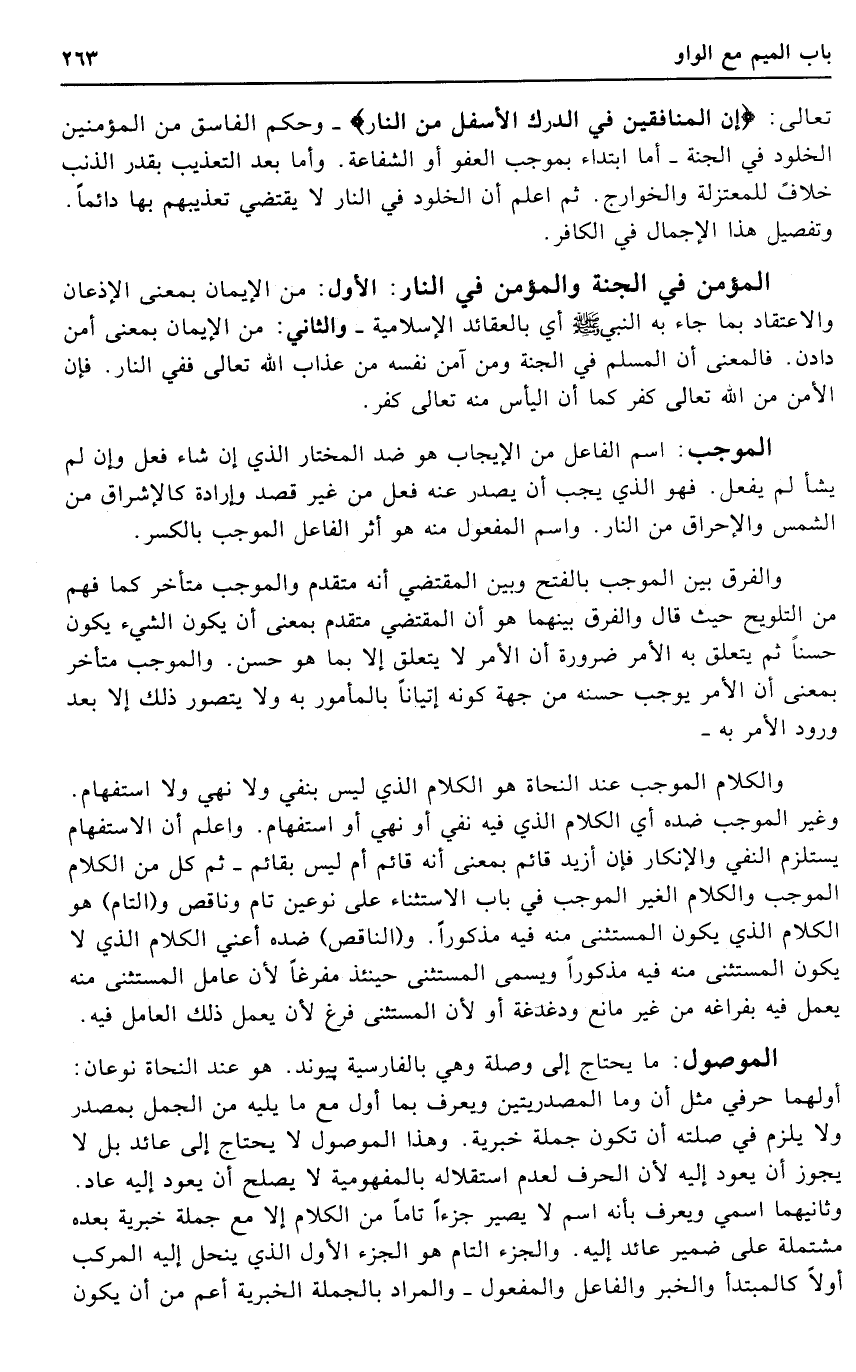 وَالْكَلَام الْمُوجب عِنْد النُّحَاة هُوَ الْكَلَام الَّذِي لَيْسَ بِنَفْي وَلَا نهي وَلَا اسْتِفْهَام. وَغير الْمُوجب ضِدّه أَي الْكَلَام الَّذِي فِيهِ نفي أَو نهي أَو اسْتِفْهَام. وَاعْلَم أَن الِاسْتِفْهَام يسْتَلْزم النَّفْي وَالْإِنْكَار فَإِن أَزِيد قَائِم بِمَعْنى أَنه قَائِم أم لَيْسَ بقائم - ثمَّ كل من الْكَلَام الْمُوجب وَالْكَلَام الْغَيْر الْمُوجب فِي بَاب الِاسْتِثْنَاء على نَوْعَيْنِ تَامّ وناقص و (التَّام) هُوَ الْكَلَام الَّذِي يكون الْمُسْتَثْنى مِنْهُ فِيهِ مَذْكُورا. و (النَّاقِص) ضِدّه أَعنِي الْكَلَام الَّذِي لَا يكون الْمُسْتَثْنى مِنْهُ فِيهِ مَذْكُورا وَيُسمى الْمُسْتَثْنى حِينَئِذٍ مفرغا لِأَن عَامل الْمُسْتَثْنى مِنْهُ يعْمل فِيهِ بفراغه من غير مَانع ودغدغة أَو لِأَن الْمُسْتَثْنى فرغ لِأَن يعْمل ذَلِك الْعَامِل فِيهِ.