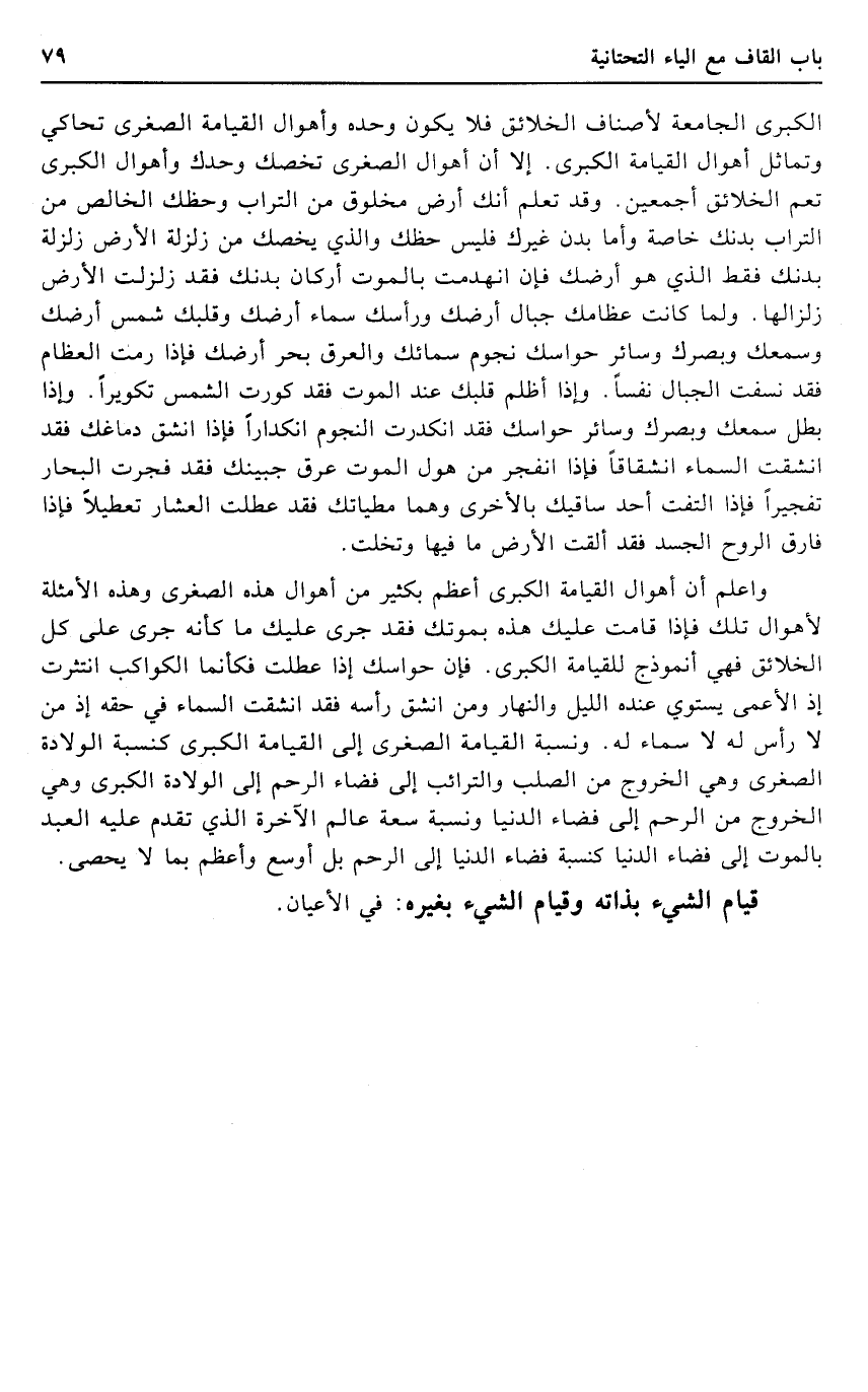 الْكُبْرَى الجامعة لأصناف الْخَلَائق فَلَا يكون وَحده وأهوال الْقِيَامَة الصُّغْرَى تحاكي وتماثل أهوال الْقِيَامَة الْكُبْرَى. إِلَّا أَن أهوال الصُّغْرَى تخصك وَحدك وأهوال الْكُبْرَى تعم الْخَلَائق أَجْمَعِينَ. وَقد تعلم أَنَّك أَرض مَخْلُوق من التُّرَاب وحظك الْخَالِص من التُّرَاب بدنك خَاصَّة وَأما بدن غَيْرك فَلَيْسَ حظك وَالَّذِي يخصك من زَلْزَلَة الأَرْض زَلْزَلَة بدنك فَقَط الَّذِي هُوَ أَرْضك فَإِن انْهَدَمت بِالْمَوْتِ أَرْكَان بدنك فقد زلزلت الأَرْض زِلْزَالهَا. وَلما كَانَت عظامك جبال أَرْضك ورأسك سَمَاء أَرْضك وقلبك شمس أَرْضك وسمعك وبصرك وَسَائِر حواسك نُجُوم سمائك والعرق بَحر أَرْضك فَإِذا رمت الْعِظَام فقد نسفت الْجبَال نفسا. وَإِذا أظلم قَلْبك عِنْد الْمَوْت فقد كورت الشَّمْس تكويرا. وَإِذا بَطل سَمعك وبصرك وَسَائِر حواسك فقد انكدرت النُّجُوم انكدارا فَإِذا انْشَقَّ دماغك فقد انشقت السَّمَاء انشقاقا فَإِذا انفجر من هول الْمَوْت عرق جبينك فقد فجرت الْبحار تفجيرا فَإِذا الْتفت أحد ساقيك بِالْأُخْرَى وهما مطياتك فقد عطلت العشار تعطيلا فَإِذا فَارق الرّوح الْجَسَد فقد أَلْقَت الأَرْض مَا فِيهَا وتخلت.