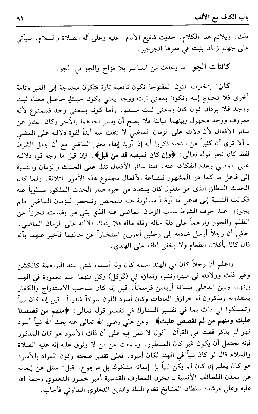 وَاعْلَم أَن رجلا كَانَ فِي الْهِنْد اسْمه كَانَ وَله أَسمَاء شَتَّى عِنْد البراهمة كالكشن وَغير ذَلِك وولادته فِي متهراونشوه ونماؤه فِي (كوكل) وكل مِنْهُمَا اسْم معمورة فِي الْهِنْد بَينهمَا وَبَين الدهلي مَسَافَة أَرْبَعِينَ فرسخا. قيل إِنَّه كَانَ صَاحب الاستدراج وَالْكفَّار يعتقدونه ويذكرون لَهُ خوارق الْعَادَات وَكَانَ أسود اللَّوْن سوادا شَدِيدا. قيل إِنَّه كَانَ نَبيا وتمسكوا فِي ذَلِك بِمَا فِي تَفْسِير المدارك فِي تَفْسِير قَوْله تَعَالَى: {مِنْهُم من قَصَصنَا عَلَيْك وَمِنْهُم من لم نَقْصُصْ عَلَيْك} . وَعَن عَليّ رَضِي الله تَعَالَى عَنهُ بعث الله نَبيا أسود فَهُوَ لم يذكر قصَّته فِي الْقُرْآن. أَقُول لَا نَص فِيهِ على أَن ذَلِك الْأسود هُوَ كَانَ الْمَذْكُور فَإِنَّهُ يحْتَمل أَن يكون غير كَانَ المسطور. وَسمعت عَن من لَا وثوق عَلَيْهِ إِنَّه عَلَيْهِ الصَّلَاة وَالسَّلَام قَالَ لَو كَانَ نَبيا فِي الْهِنْد لَكَانَ أسود. فعلى تَقْدِير صِحَّته وَكَون المُرَاد بالأسود هُوَ كَانَ يعلم إِن كَانَ لم يكن نَبيا بل إيمَانه مَشْكُوك بل مَرْجُوح. قيل: سُئِلَ عَن إيمَانه عَن مَعْدن اللطائف الأنسية - مخزن المعارف القدسية أَمِير خسرو الدهلوي رَحْمَة الله عَلَيْهِ وعَلى مرشده سُلْطَان الْمَشَايِخ نظام الْملَّة وَالدّين الدهلوي البداوني فَأجَاب.