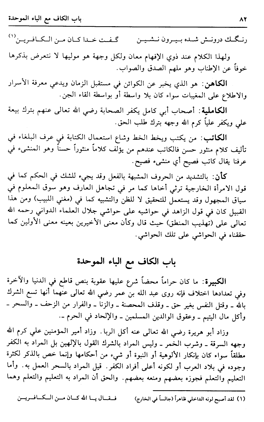 الْكَبِيرَة: مَا كَانَ حَرَامًا مَحْضا شرع عَلَيْهَا عُقُوبَة بِنَصّ قَاطع فِي الدُّنْيَا وَالْآخِرَة وَفِي تعدادها اخْتِلَاف فَإِنَّهُ روى عبد الله بن عمر رَضِي الله تَعَالَى عَنْهُمَا أَنَّهَا تسع الشّرك بِاللَّه - وَقتل النَّفس بِغَيْر حق - وَقذف المحصنة - وَالزِّنَا - والفرار من الزَّحْف - وَالسحر - وَأكل مَال الْيَتِيم - وعقوق الْوَالِدين الْمُسلمين - والإلحاد فِي الْحرم -.