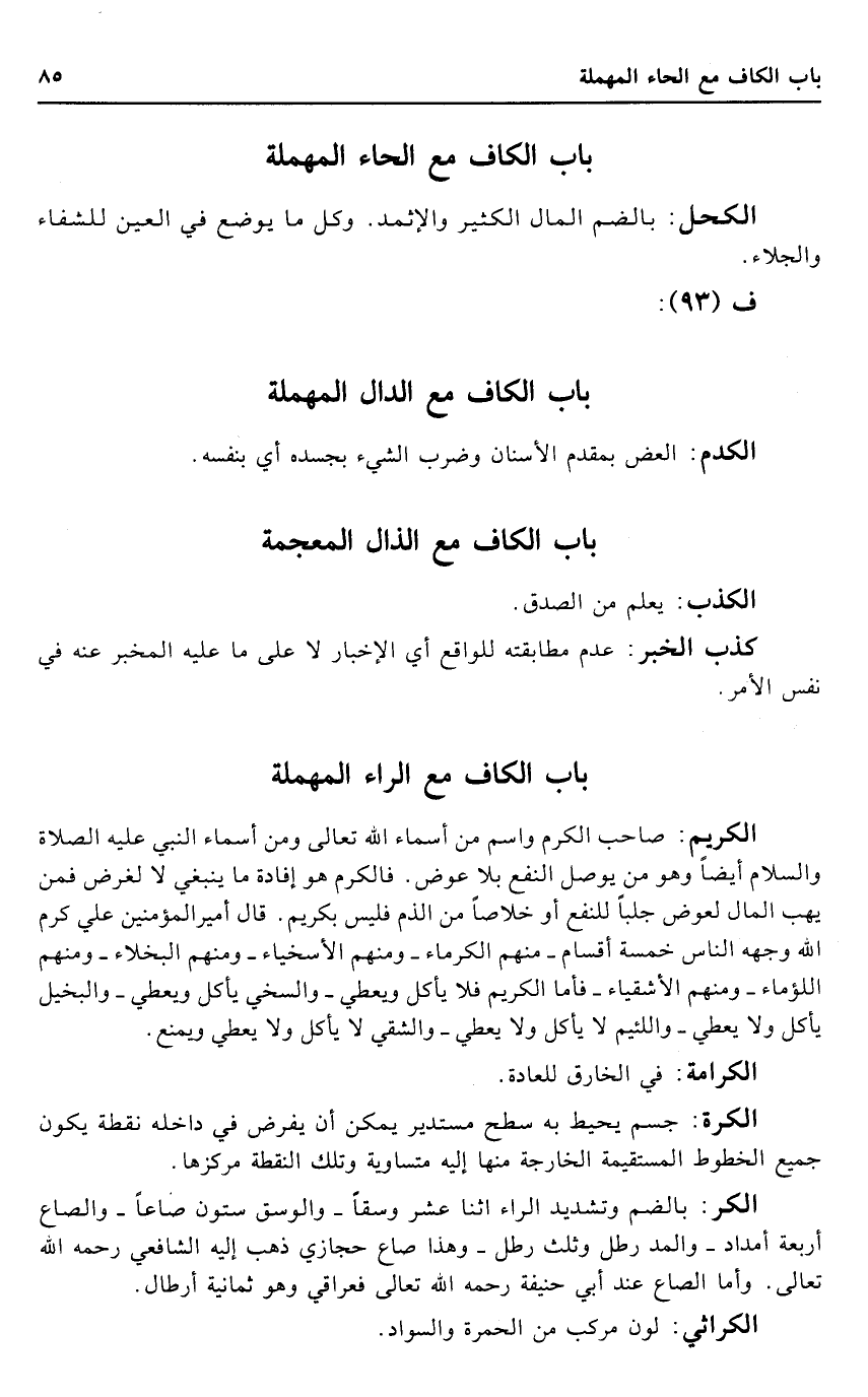 الْكَرِيم: صَاحب الْكَرم وَاسم من أَسمَاء الله تَعَالَى وَمن أَسمَاء النَّبِي عَلَيْهِ الصَّلَاة وَالسَّلَام أَيْضا وَهُوَ من يُوصل النَّفْع بِلَا عوض. فالكرم هُوَ إِفَادَة مَا يَنْبَغِي لَا لغَرَض فَمن يهب المَال لعوض جلبا للنفع أَو خلاصا من الذَّم فَلَيْسَ بكريم. قَالَ أَمِير الْمُؤمنِينَ عَليّ كرم الله وَجهه النَّاس خَمْسَة أَقسَام - مِنْهُم الكرماء - وَمِنْهُم الأسخياء - وَمِنْهُم البخلاء - وَمِنْهُم اللؤماء - وَمِنْهُم الأشقياء - فَأَما الْكَرِيم فَلَا يَأْكُل وَيُعْطِي - والسخي يَأْكُل وَيُعْطِي - والبخيل يَأْكُل وَلَا يُعْطي - واللئيم لَا يَأْكُل وَلَا يُعْطي - والشقي لَا يَأْكُل وَلَا يُعْطي وَيمْنَع.