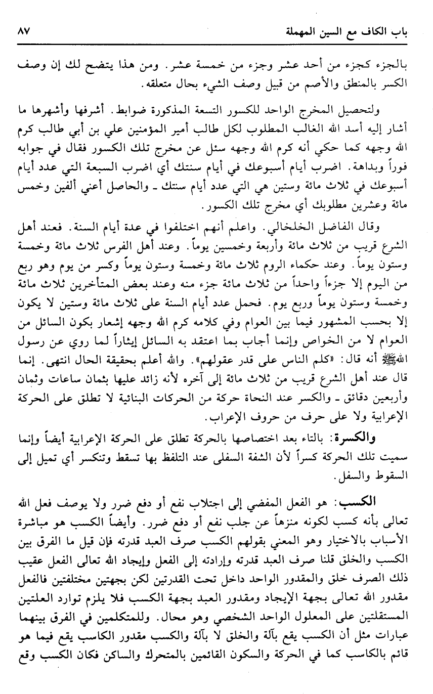 وَقَالَ الْفَاضِل الخلخالي. وَاعْلَم أَنهم اخْتلفُوا فِي عدَّة أَيَّام السّنة. فَعِنْدَ أهل الشَّرْع قريب من ثَلَاث مائَة وَأَرْبَعَة وَخمسين يَوْمًا. وَعند أهل الْفرس ثَلَاث مائَة وَخَمْسَة وَسِتُّونَ يَوْمًا. وَعند حكماء الرّوم ثَلَاثَة مائَة وَخَمْسَة وَسِتُّونَ يَوْمًا وَكسر من يَوْم وَهُوَ ربع من الْيَوْم إِلَّا جُزْءا وَاحِدًا من ثَلَاث مائَة جُزْء مِنْهُ وَعند بعض الْمُتَأَخِّرين ثَلَاث مائَة وَخَمْسَة وَسِتُّونَ يَوْمًا وَربع يَوْم. فَحمل عدد أَيَّام السّنة على ثَلَاث مائَة وَسِتِّينَ لَا يكون إِلَّا بِحَسب الْمَشْهُور فِيمَا بَين الْعَوام وَفِي كَلَامه كرم الله وَجهه إِشْعَار بِكَوْن السَّائِل من الْعَوام لَا من الْخَواص وَإِنَّمَا أجَاب بِمَا اعْتقد بِهِ السَّائِل إيثارا لما رُوِيَ عَن رَسُول الله - صَلَّى اللَّهُ عَلَيْهِ وَسَلَّم َ - أَنه قَالَ: " كلم النَّاس على قدر عُقُولهمْ ". وَالله أعلم بِحَقِيقَة الْحَال انْتهى. إِنَّمَا قَالَ عِنْد أهل الشَّرْع قريب من ثَلَاث مائَة إِلَى آخِره لِأَنَّهُ زَائِد عَلَيْهَا بثمان سَاعَات وثمان وَأَرْبَعين دقائق - وَالْكَسْر عِنْد النُّحَاة حَرَكَة من الحركات البنائية لَا تطلق على الْحَرَكَة الإعرابية وَلَا على حرف من حُرُوف الْإِعْرَاب.