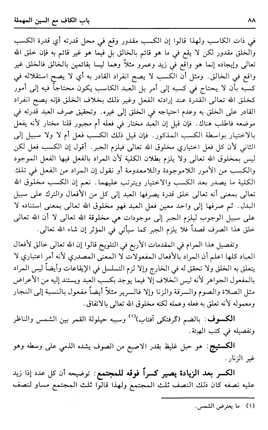 فِي ذَات الكاسب وَلِهَذَا قَالُوا إِن الْكسْب مَقْدُور وَقع فِي مَحل قدرته أَي قدرَة الْكسْب والخلق مَقْدُور لَكِن لَا يَقع فِي مَا هُوَ قَائِم بالخالق بل فِيمَا هُوَ غير قَائِم بِهِ فَإِن خلق الله تَعَالَى وإيجاده إِنَّمَا هُوَ وَاقع فِي زيد وَعَمْرو مثلا وهما ليسَا بقائمين بالخالق فالخلق غير وَاقع فِي الْخَالِق. وَمثل أَن الْكسْب لَا يَصح انْفِرَاد الْقَادِر بِهِ أَي لَا يَصح استقلاله فِي كَسبه بِأَن لَا يحْتَاج فِي كَسبه إِلَى أَمر بل العَبْد الكاسب يكون مُحْتَاجا فِيهِ إِلَى أُمُور كخلق الله تَعَالَى الْقُدْرَة عِنْد إِرَادَته الْفِعْل وَغير ذَلِك بِخِلَاف الْخلق فَإِنَّهُ يَصح انْفِرَاد الْقَادِر على الْخلق بِهِ وَعدم احْتِيَاجه فِي الْخلق إِلَى غَيره. وَتَحْقِيق صرف العَبْد قدرته فِي مَوْضِعه فاطلب هُنَاكَ. فَإِن قيل إِن العَبْد مُخْتَار فِي فعله أم مجبور قُلْنَا مُخْتَار لِأَنَّهُ يفعل بِالِاخْتِيَارِ بِوَاسِطَة الْكسْب الْمَذْكُور. فَإِن قيل ذَلِك الْكسْب فعل أم لَا وَلَا سَبِيل إِلَى الثَّانِي لِأَن كل فعل اخْتِيَاري مَخْلُوق الله تَعَالَى فَيلْزم الْجَبْر. أَقُول إِن الْكسْب فعل لَكِن لَيْسَ بمخلوق الله تَعَالَى وَلَا يلْزم بطلَان الْكُلية لِأَن المُرَاد بِالْفِعْلِ فِيهَا الْفِعْل الْمَوْجُود وَالْكَسْب من الْأُمُور اللاموجودة واللامعدومة أَو نقُول إِن المُرَاد من الْفِعْل فِي تِلْكَ الْكُلية مَا يصدر بعد الْكسْب وَالِاخْتِيَار وَيَتَرَتَّب عَلَيْهِمَا. نعم إِن الْكسْب مَخْلُوق الله تَعَالَى بِمَعْنى أَنه تَعَالَى خلق قدرَة يصرفهَا العَبْد إِلَى كل من الْأَفْعَال وَالتّرْك على سَبِيل الْبَدَل. ثمَّ صرفهَا إِلَى وَاحِد معِين فعل العَبْد فَهُوَ مَخْلُوق الله تَعَالَى بِمَعْنى استناده لَا على سَبِيل الْوُجُوب ليلزم الْجَبْر إِلَى موجودات هِيَ مخلوقة الله تَعَالَى لَا أَن الله تَعَالَى خلق هَذَا الصّرْف قصدا فَلَا يلْزم الْجَبْر كَمَا سَيَأْتِي فِي الْمُؤثر إِن شَاءَ الله تَعَالَى.