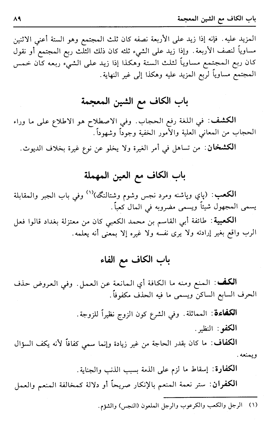 الكعب: (باي وباشنه ومرد نجس وشوم وشتالنكك) وَفِي بَاب الْجَبْر والمقابلة يُسمى الْمَجْهُول شَيْئا وَيُسمى مضروبه فِي المَال كَعْبًا.
