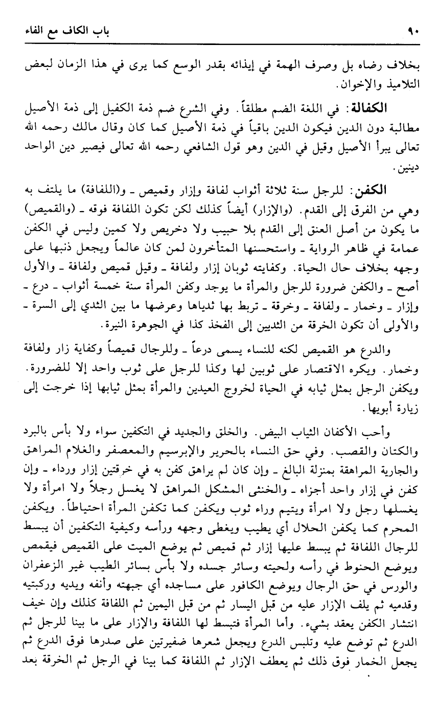 الْكَفَن: للرجل سنة ثَلَاثَة أَثوَاب لفافة وَإِزَار وقميص - و (اللفافة) مَا يلتف بِهِ وَهِي من الْفرق إِلَى الْقدَم. (والإزار) أَيْضا كَذَلِك لَكِن تكون اللفافة فَوْقه - (والقميص) مَا يكون من أصل الْعُنُق إِلَى الْقدَم بِلَا حبيب وَلَا دخريص وَلَا كمين وَلَيْسَ فِي الْكَفَن عِمَامَة فِي ظَاهر الرِّوَايَة - واستحسنها الْمُتَأَخّرُونَ لمن كَانَ عَالما وَيجْعَل ذنبها على وَجهه بِخِلَاف حَال الْحَيَاة. وكفايته ثَوْبَان إِزَار ولفافة - وَقيل قَمِيص ولفافة - وَالْأول أصح - والكفن ضَرُورَة للرجل وَالْمَرْأَة مَا يُوجد وكفن الْمَرْأَة سنة خَمْسَة أَثوَاب - درع - وَإِزَار - وخمار - ولفافة - وخرقة - ترْبط بهَا ثدياها وعرضها مَا بَين الثدي إِلَى السُّرَّة - وَالْأولَى أَن تكون الْخِرْقَة من الثديين إِلَى الْفَخْذ كَذَا فِي الْجَوْهَرَة النيرة.