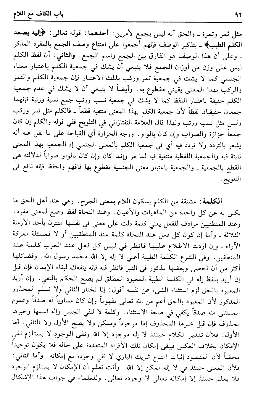 الْكَلِمَة: مُشْتَقَّة من الْكَلم بِسُكُون اللَّام بِمَعْنى الْجرْح. وَهِي عِنْد أهل الْحق مَا يكنى بِهِ عَن كل وَاحِدَة من الماهيات والأعيان. وَعند النُّحَاة لفظ وضع لِمَعْنى مُفْرد. وَعند المنطقيين مرادف للْفِعْل يَعْنِي كلمة دلّت على معنى فِي نَفسهَا مقترن بِأحد الْأَزْمِنَة الثَّلَاثَة - وَأما إِن كَون كل فعل عِنْد النُّحَاة كلمة عِنْد المنطقيين أَو لَا فمسئلة معركة الآراء - وَإِن أردْت الِاطِّلَاع عَلَيْهَا فَانْظُر فِي لَيْسَ كل فعل عِنْد الْعَرَب كلمة عِنْد المنطقين، وَفِي الشَّرْع الْكَلِمَة الطّيبَة أَعنِي لَا إِلَه إِلَّا الله مُحَمَّد رَسُول الله. وفضائلها أَكثر من أَن تحصى وَبَعضهَا مَذْكُور فِي الْقَبْر فَانْظُر فِيهِ فَإِنَّهُ ينفعك لبَقَاء الْإِيمَان فَإِن قيل إِن أُرِيد بِلَفْظ إِلَه فِي الْكَلِمَة الطّيبَة المعبود الْمُطلق لم يَصح الحكم بِالنَّفْيِ. وَإِن أُرِيد المعبود بِالْحَقِّ لزم اسْتثِْنَاء الشَّيْء عَن نَفسه أَقُول: إِنَّا نَخْتَار الثَّانِي وَلَا نسلم الْمَحْذُور الْمَذْكُور لِأَن المعبود بِالْحَقِّ أَعم من الله تَعَالَى مفهوما وَإِن كَانَ مُسَاوِيا لَهُ صدقا وَعُمُوم الْمُسْتَثْنى مِنْهُ صدقا يَكْفِي فِي صِحَة الِاسْتِثْنَاء. وَكلمَة لَا لنفي الْجِنْس وإله اسْمهَا وخبرها مَحْذُوف فَإِن قيل خَبَرهَا الْمَحْذُوف إِمَّا مَوْجُودا وممكن وَلَا يَصح الأول وَلَا الثَّانِي. أما الأول: فَلِأَن تَقْدِير الْكَلَام حِينَئِذٍ لَا إِلَه مَوْجُود إِلَّا الله وَنفي الْوُجُود لَا يسْتَلْزم نفي الْإِمْكَان بِخِلَاف الْعَكْس فَيبقى إِمْكَان تِلْكَ الْأَفْرَاد المتعددة على حَاله فَلَا يكون توحيدا مَحْضا لِأَن الْمَقْصُود إِثْبَات امْتنَاع شريك الْبَارِي لَا نفي وجوده مَعَ إِمْكَانه. وأمال الثَّانِي: فَلِأَن الْمَعْنى حِينَئِذٍ فِي لَا إِلَه مُمكن إِلَّا الله. وَأَنت تعلم أَن الْإِمْكَان لَا يسْتَلْزم الْوُجُود فَلَا يعلم حِينَئِذٍ إِلَّا إِمْكَانه تَعَالَى لَا وجوده تَعَالَى. وللعلماء فِي جَوَاب هَذَا الْإِشْكَال