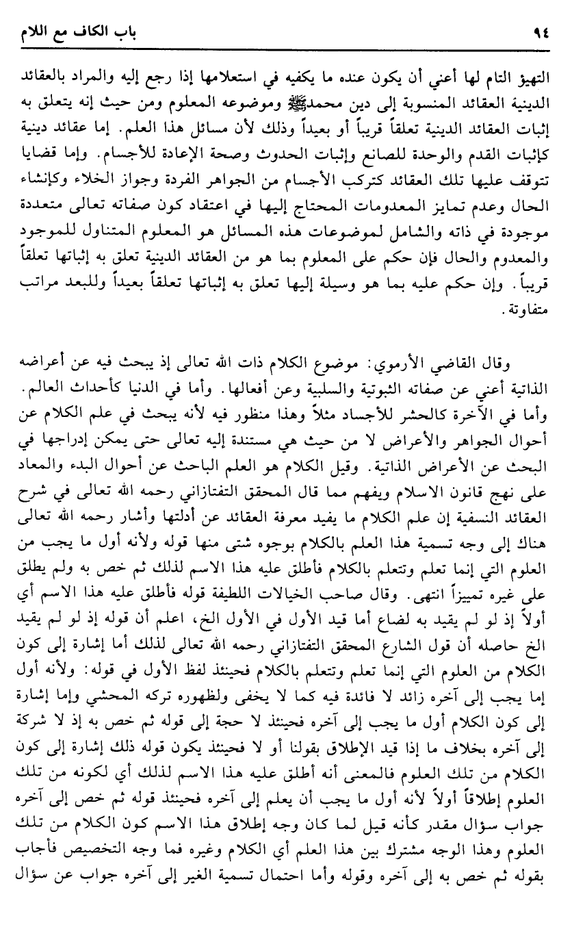 التهيؤ التَّام لَهَا أَعنِي أَن يكون عِنْده مَا يَكْفِيهِ فِي استعلامها إِذا رَجَعَ إِلَيْهِ وَالْمرَاد بالعقائد الدِّينِيَّة العقائد المنسوبة إِلَى دين مُحَمَّد - صَلَّى اللَّهُ عَلَيْهِ وَسَلَّم َ - وموضوعه الْمَعْلُوم وَمن حَيْثُ إِنَّه يتَعَلَّق بِهِ إِثْبَات العقائد الدِّينِيَّة تعلقا قَرِيبا أَو بَعيدا وَذَلِكَ لِأَن مسَائِل هَذَا الْعلم. إِمَّا عقائد دينية كإثبات الْقدَم والوحدة للصانع وَإِثْبَات الْحُدُوث وَصِحَّة الْإِعَادَة للأجسام. وَإِمَّا قضايا تتَوَقَّف عَلَيْهَا تِلْكَ العقائد كتركب الْأَجْسَام من الْجَوَاهِر الفردة وَجَوَاز الْخَلَاء وكإنشاء الْحَال وَعدم تمايز المعدومات الْمُحْتَاج إِلَيْهَا فِي اعْتِقَاد كَون صِفَاته تَعَالَى مُتعَدِّدَة مَوْجُودَة فِي ذَاته والشامل لموضوعات هَذِه الْمسَائِل هُوَ الْمَعْلُوم المتناول للموجود والمعدوم وَالْحَال فَإِن حكم على الْمَعْلُوم بِمَا هُوَ من العقائد الدِّينِيَّة تعلق بِهِ إِثْبَاتهَا تعلقا قَرِيبا. وَإِن حكم عَلَيْهِ بِمَا هُوَ وَسِيلَة إِلَيْهَا تعلق بِهِ إِثْبَاتهَا تعلقا بَعيدا وللبعد مَرَاتِب مُتَفَاوِتَة.
