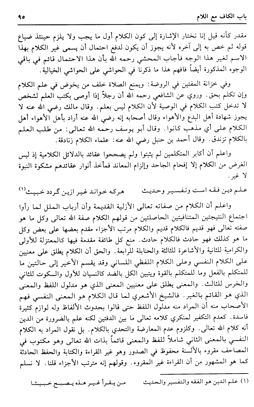 وَاعْلَم أَن الْكَلَام من صِفَاته تَعَالَى الأزلية الْقَدِيمَة وَأَن أَرْبَاب الْملَل لما رَأَوْا اجْتِمَاع النتيجتين المتنافيتين الحاصلتين من قَوْلهم الْكَلَام صفة الله تَعَالَى وكل مَا هُوَ صفته تَعَالَى فَهُوَ قديم فَالْكَلَام قديم وَالْكَلَام مُرَتّب الْأَجْزَاء مقدم بَعْضهَا على بعض وكل مَا هُوَ كَذَلِك فَهُوَ حَادث فَالْكَلَام حَادث. منع كل طَائِفَة مُقَدّمَة فِيهَا كالمعتزلة للاولى والكرامية للثَّانِيَة والأشاعرة للثالثة والحنابلة للرابعة. وَالْحق أَن الْكَلَام يُطلق على مَعْنيين على الْكَلَام النَّفْسِيّ وعَلى الْكَلَام اللَّفْظِيّ اللساني وَقد يقسم الْأَخير إِلَى حالتين مَا للمتكلم بِالْفِعْلِ وَمَا للمتكلم بِالْقُوَّةِ ويتبين الْكل بالضد كالنسيان للْأولِ وَالسُّكُوت للثَّانِي والخرس للثَّالِث. وَالْمعْنَى يُطلق على مَعْنيين الْمَعْنى الَّذِي هُوَ مَدْلُول اللَّفْظ وَالْمعْنَى الَّذِي هُوَ الْقَائِم بِالْغَيْر. فالشيخ الْأَشْعَرِيّ لما قَالَ الْكَلَام هُوَ الْمَعْنى النَّفْسِيّ فهم الْأَصْحَاب مِنْهُ أَن المُرَاد مِنْهُ مَدْلُول اللَّفْظ حَتَّى قَالُوا بحدوث الْأَلْفَاظ وَله لَوَازِم كَثِيرَة فَاسِدَة. كَعَدم التَّكْفِير لمنكري كَلَامه تَعَالَى مَا بَين الدفتين لكنه علم بِالضَّرُورَةِ من الدّين أَنه كَلَام الله تَعَالَى. وكلزوم عدم الْمُعَارضَة والتحدي بالْكلَام. بل نقُول المُرَاد بِهِ الْكَلَام النَّفْسِيّ بِالْمَعْنَى الثَّانِي شَامِلًا للفظ وَالْمعْنَى قَائِما بِذَات الله تَعَالَى وَهُوَ مَكْتُوب فِي الْمَصَاحِف مقروء بالألسنة مَحْفُوظ فِي الصُّدُور وَهُوَ غير الْقِرَاءَة وَالْكِتَابَة وَالْحِفْظ الْحَادِثَة كَمَا هُوَ الْمَشْهُور من أَن الْقِرَاءَة غير المقروء. وَقَوْلهمْ إِنَّه مترتب الْأَجْزَاء قُلْنَا. لَا نسلم