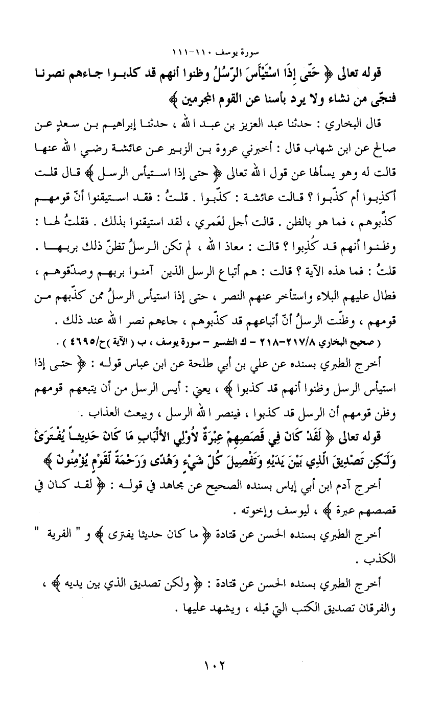 قال البخاري: حدثنا عبد العزيز بن عبد الله، حدثنا إبراهيم بن سعد عن صالح عن ابن شهاب قال: أخبرني عروة بن الزبير عن عائشة رضي الله عنها قالت له وهو يسألها عن قول الله تعالى (حتى إذا استيأس الرسل) قال قلت أكذِبوا أم كذّبوا؟ قالت عائشة: كذّبوا. قلتُ: فقد استيقنوا أنّ قومهم كذبوهم، فما هو بالظن. قالت أجل لعَمري، لقد استيقنوا بذلك. فقلتُ لها: وظنوا أنهم قد كُذِبوا؟ قالت: معاذ الله، لم تكن الرسلُ تظنّ ذلك بربها.