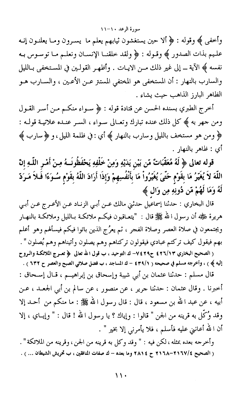 قال البخاري: حدثنا إسماعيل حدثني مالك عن أبي الزناد عن الأعرج عن أبي هريرة - رضي الله عنه - أن رسول الله - صَلَّى اللَّهُ عَلَيْهِ وَسَلَّمَ - قال: "يتعاقبون فيكم ملائكة بالليل وملائكة بالنهار ويجتمعون في صلاة العصر وصلاة الفجر، ثم يعرُج الذين باتوا فيكم فيسألهم وهو أعلم بهم فيقول كيف تركتم عبادي فيقولون تركناهم وهم يصلون وأتيناهم وهم يُصلون".