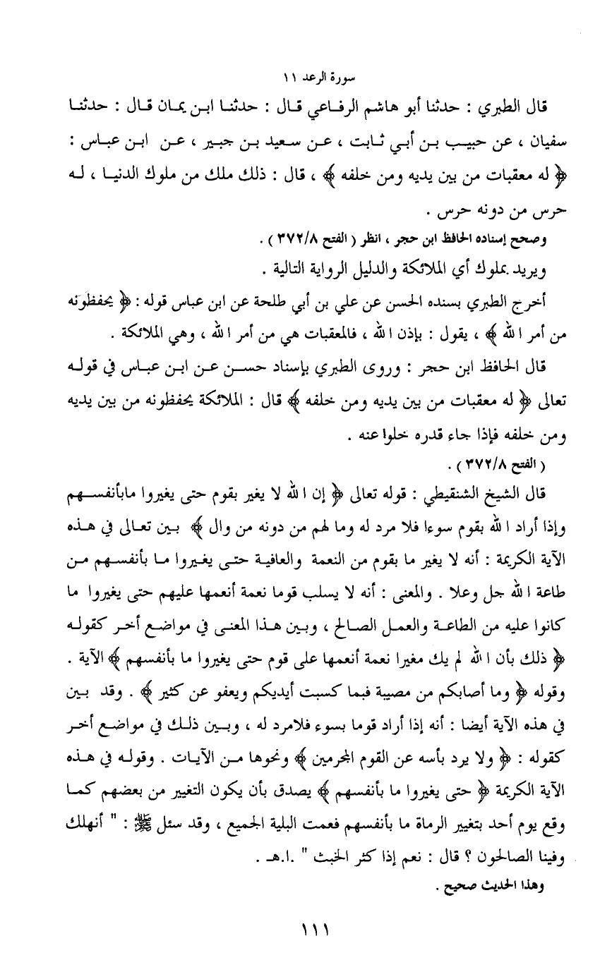 قال الحافظ ابن حجر: وروى الطبري بإسناد حسن عن ابن عباس في قوله تعالى (له معقبات من بين يديه ومن خلفه) قال: الملائكة يحفظونه من بين يديه ومن خلفه فإذا جاء قدره خلوا عنه.