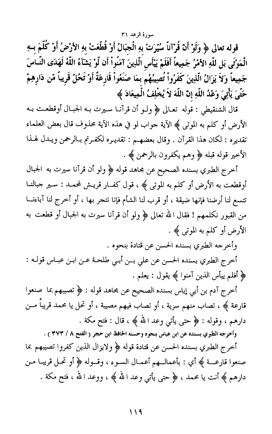 أخرج الطبري بسنده الصحيح عن مجاهد قوله (ولو أن قرآنا سيرت به الجبال أو قطعت به الأرض أو كلم به الموتى) ، قول كفار قريش لمحمد: سير جبالنا تتسع لنا أرضنا فإنها ضيقة، أو قرب لنا الشأم فإنا نتجر بها، أو أخرج لنا آباءنا من القبور نكلمهم! فقال الله تعالى (ولو أن قرآنا سيرت به الجبال أو قطعت به الأرض أو كلم به الموتى) .