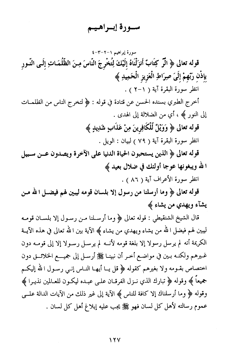 قوله تعالى (الر كِتَابٌ أَنْزَلْنَاهُ إِلَيْكَ لِتُخْرِجَ النَّاسَ مِنَ الظُّلُمَاتِ إِلَى النُّورِ بِإِذْنِ رَبِّهِمْ إِلَى صِرَاطِ الْعَزِيزِ الْحَمِيدِ)