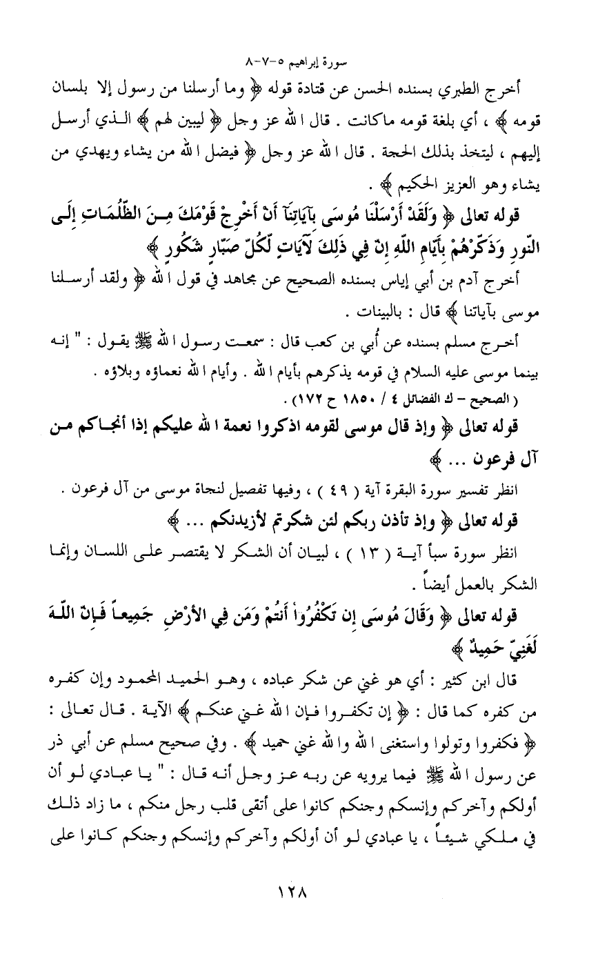 أخرج الطبري بسنده الحسن عن قتادة قوله (وما أرسلنا من رسول إلا بلسان قومه) ، أي بلغة قومه ما كانت. قال الله عز وجل (ليبين لهم) الذي أرسل إليهم، ليتخذ بذلك الحجة. قال الله عز وجل (فيضل الله من يشاء ويهدي من يشاء وهو العزيز الحكيم) .