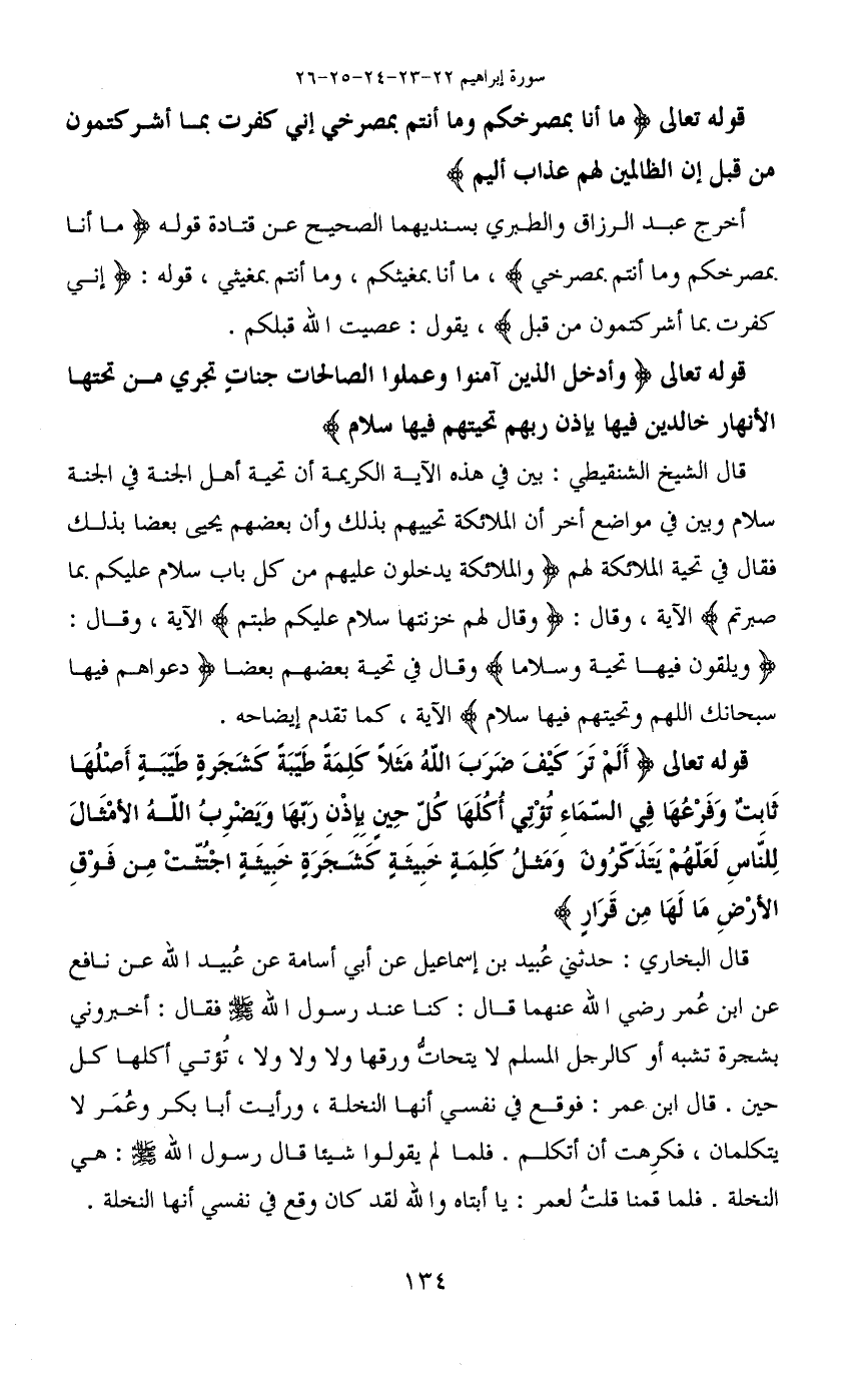 قوله تعالى (أَلَمْ تَرَ كَيْفَ ضَرَبَ اللَّهُ مَثَلًا كَلِمَةً طَيِّبَةً كَشَجَرَةٍ طَيِّبَةٍ أَصْلُهَا ثَابِتٌ وَفَرْعُهَا فِي السَّمَاءِ (24) تُؤْتِي أُكُلَهَا كُلَّ حِينٍ بِإِذْنِ رَبِّهَا وَيَضْرِبُ اللَّهُ الْأَمْثَالَ لِلنَّاسِ لَعَلَّهُمْ يَتَذَكَّرُونَ (25) وَمَثَلُ كَلِمَةٍ خَبِيثَةٍ كَشَجَرَةٍ خَبِيثَةٍ اجْتُثَّتْ مِنْ فَوْقِ الْأَرْضِ مَا لَهَا مِنْ قَرَارٍ)