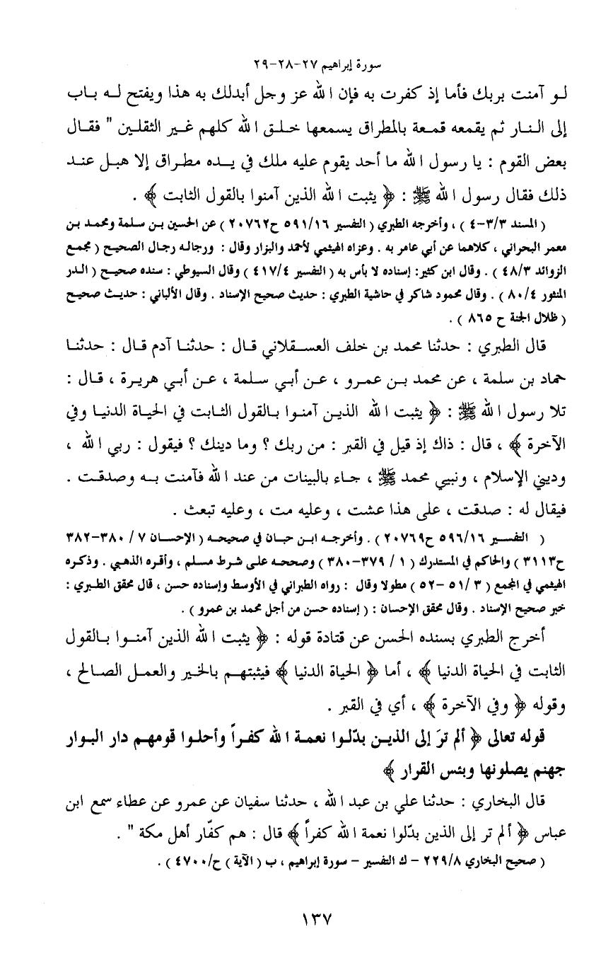 (صحيح البخاري 8/229- ك التفسير- سورة إبراهيم، ب (الآية) ح/4700) .
