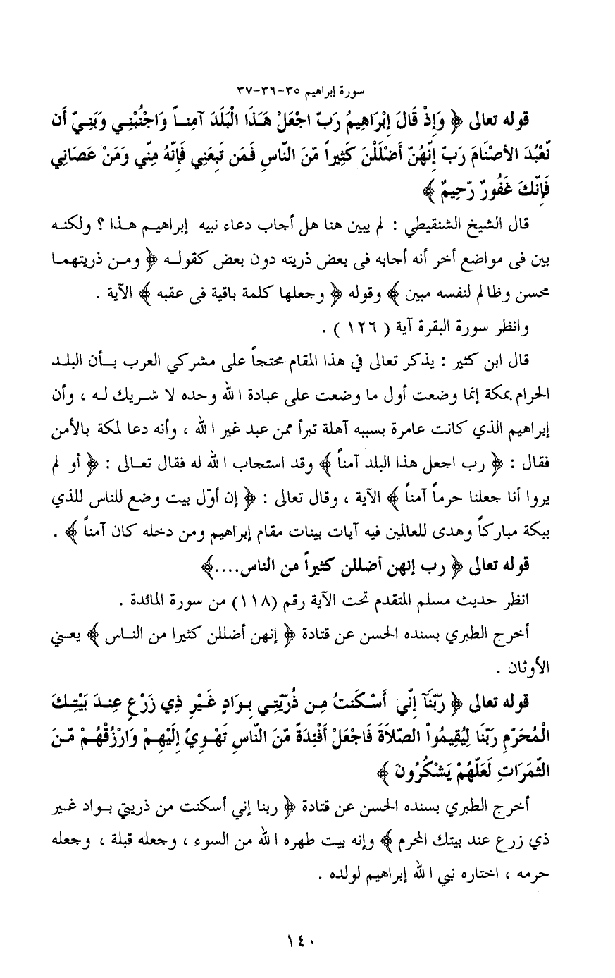 قوله تعالى (وَإِذْ قَالَ إِبْرَاهِيمُ رَبِّ اجْعَلْ هَذَا الْبَلَدَ آَمِنًا وَاجْنُبْنِي وَبَنِيَّ أَنْ نَعْبُدَ الْأَصْنَامَ (35) رَبِّ إِنَّهُنَّ أَضْلَلْنَ كَثِيرًا مِنَ النَّاسِ فَمَنْ تَبِعَنِي فَإِنَّهُ مِنِّي وَمَنْ عَصَانِي فَإِنَّكَ غَفُورٌ رَحِيمٌ)