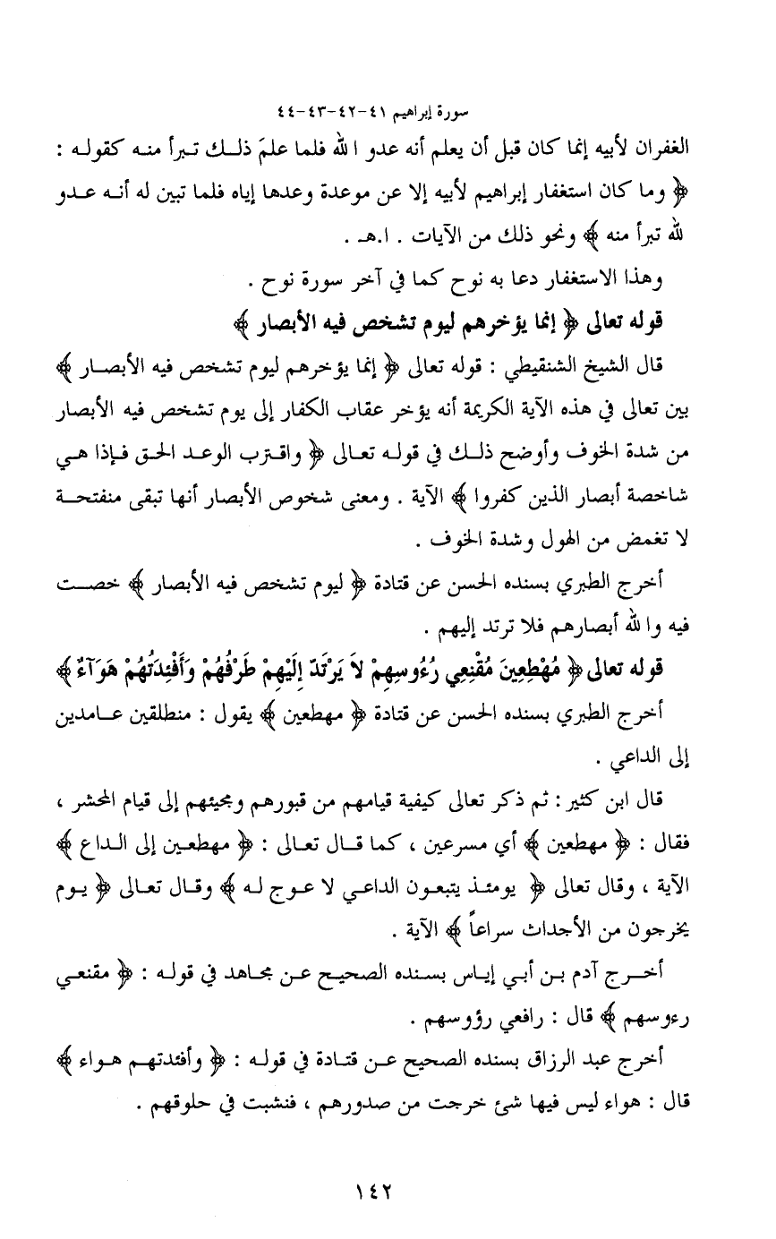 قال الشيخ الشنقيطي: قوله تعالى (إنما يؤخرهم ليوم تشخص فيه الأبصار) بين تعالى في هذه الآية الكريمة أنه يؤخر عقاب الكفار إلى يوم تشخص فيه الأبصار من شدة الخوف وأوضح ذلك في قوله تعالى (واقترب الوعد الحق فإذا هي شاخصة أبصار الذين كفروا) الآية. ومعنى شخوص الأبصار أنها تبقى منفتحة لا تغمض من الهول وشدة الخوف.