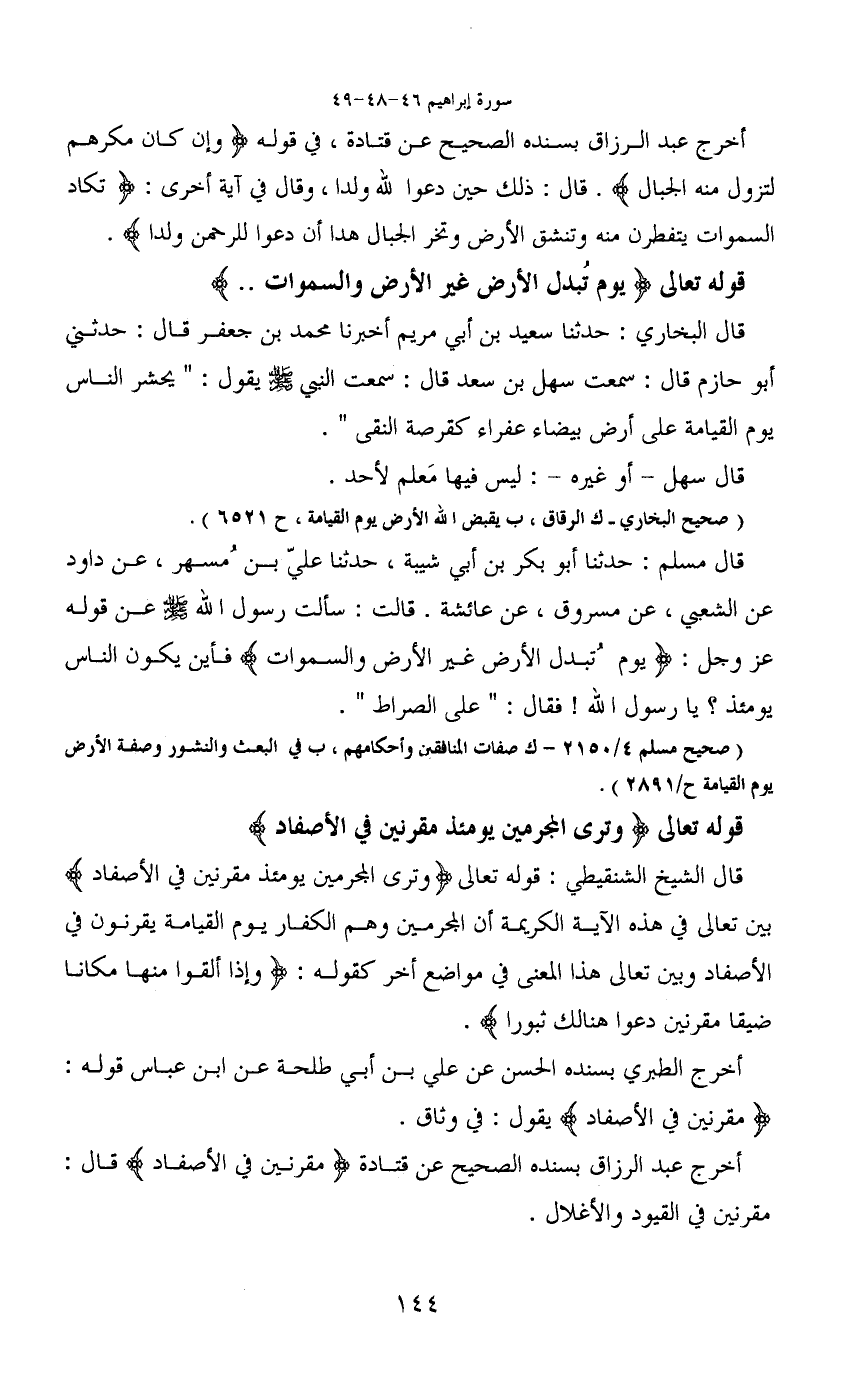 قال الشيخ الشنقيطي: قوله تعالى (وترى المجرمين يومئذ مقرنين في الأصفاد) بين تعالى في هذه الآية الكريمة أن المجرمين وهم الكفار يوم القيامة يقرنون في الأصفاد وبين تعالى هذا المعنى في مواضع أخر كقوله: (وإذا ألقوا منها مكانا ضيقا مقرنين دعوا هنالك ثبورا) .
