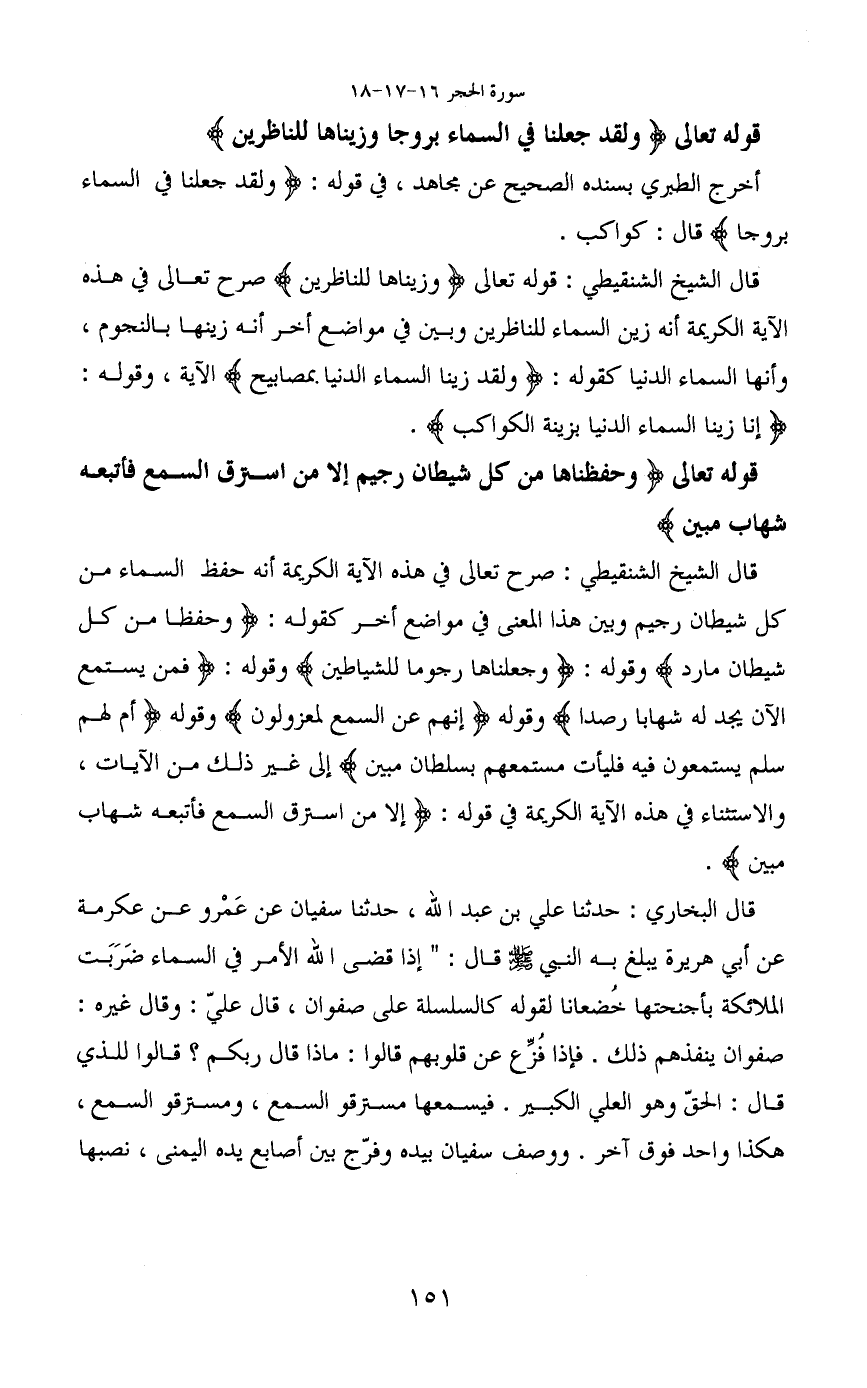 قال الشيخ الشنقيطي: صرح تعالى في هذه الآية الكريمة أنه حفظ السماء من كل شيطان رجيم وبين هذا المعنى في مواضع أخر كقوله: (وحفظا من كل شيطان مارد) وقوله: (وجعلناها رجوما للشياطين) وقوله: (فمن يستمع الآن يجد له شهابا رصدا) وقوله (إنهم عن السمع لمعزولون) وقوله (أم لهم سلم يستمعون فيه فليأت مستمعهم بسلطان مبين) إلى غير ذلك من الآيات، والاستثناء في هذه الآية الكريمة في قوله: (إلا من استرق السمع فأتبعه شهاب مبين) .