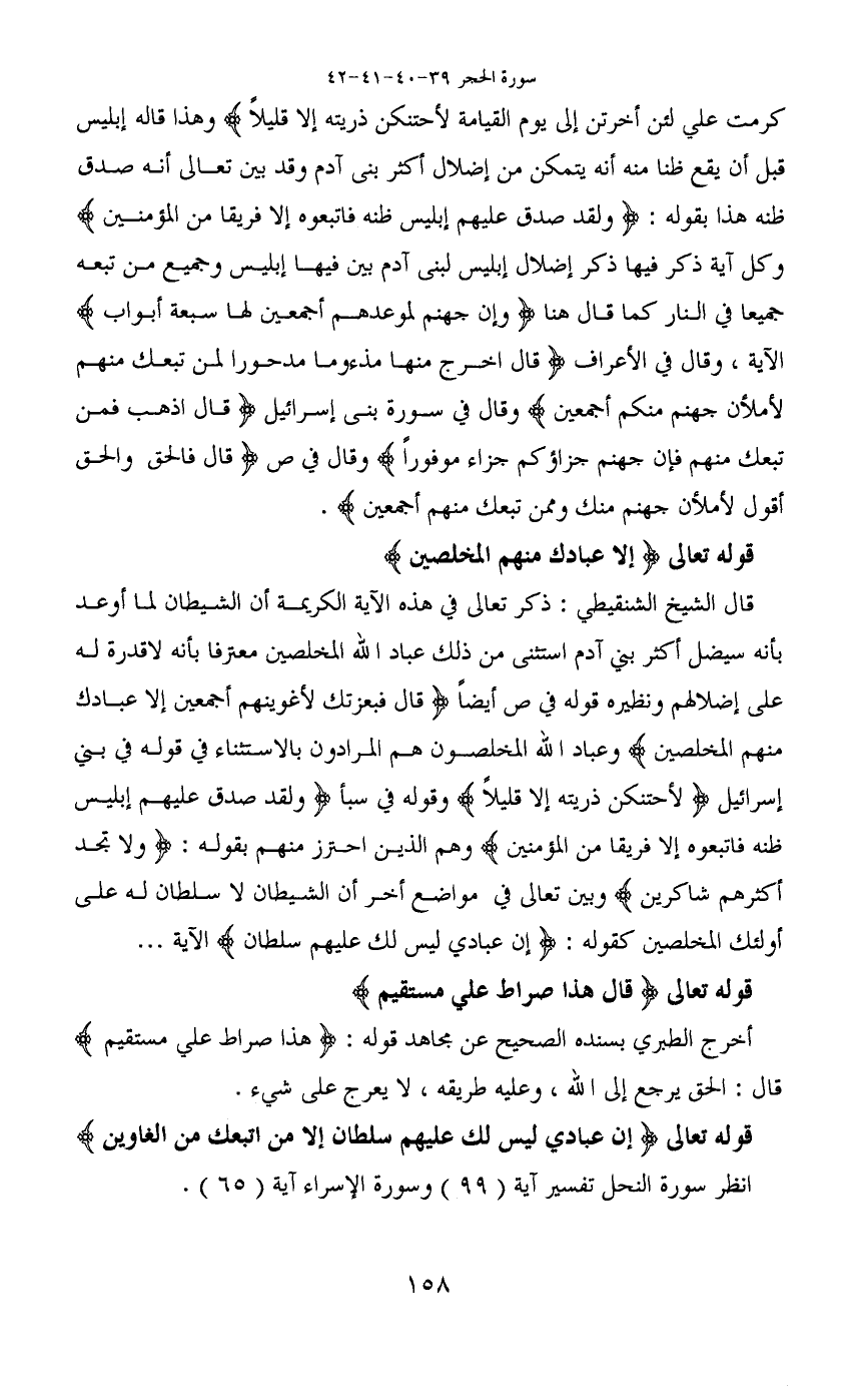 قوله تعالى (إن عبادي ليس لك عليهم سلطان إلا من اتبعك من الغاوين) انظر سورة النحل تفسير آية (99) وسورة الإسراء آية (65) .