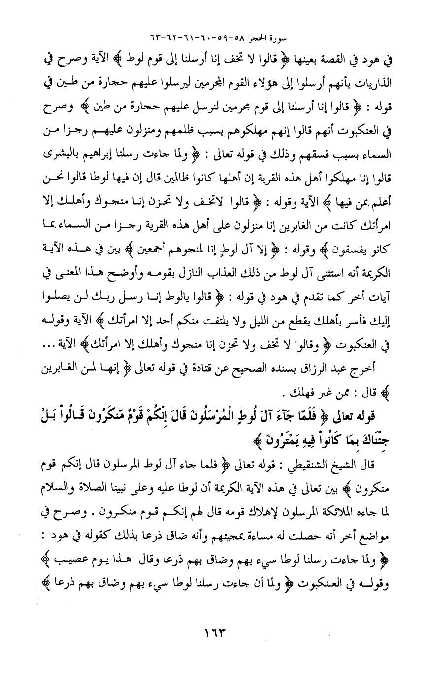 في هود في القصة بعينها (قالوا لا تخف إنا أرسلنا إلى قوم لوط) الآية وصرح في الذاريات بأنهم أرسلوا إلى هؤلاء القوم المجرمين ليرسلوا عليهم حجارة من طين في قوله: (قالوا إنا أرسلنا إلى قوم مجرمين لنرسل عليهم حجارة من طين) وصرح في العنكبوت أنهم قالوا إنهم مهلكوهم بسبب ظلمهم ومنزلون عليهم رجزا من السماء بسبب فسقهم وذلك في قوله تعالى: (ولا جاءت رسلنا إبراهيم بالبشرى قالوا إنا مهلكوا أهل هذه القرية إن أهلها كانوا ظالمين قال إن فيها لوطا قالوا نحن أعلم بمن فيها) الآية وقوله: (قالوا لا تخف ولا تحزن إنا منجوك وأهلك إلا امرأتك كانت من الغابرين إنا منزلون على أهل هذه القرية رجزا من السماء بما كانوا يفسقون) وقوله: (إلا آل لوطٍ إنا لمنجوهم أجمعين) بين في هذه الآية الكريمة أنه استثنى آل لوط من ذلك العذاب النازل بقومه وأوضح هذا المعنى في آيات أخر كما تقدم في هود في قوله: (قالوا يا لوط إنا رسل ربك لن يصلوا إليك فأسر بأهلك بقطع من الليل ولا يلتفت منكم أحد إلا امرأتك) الآية وقوله في العنكبوت (وقالوا لا تخف ولا تحزن إنا منجوك وأهلك إلا امرأتك) الآية ...