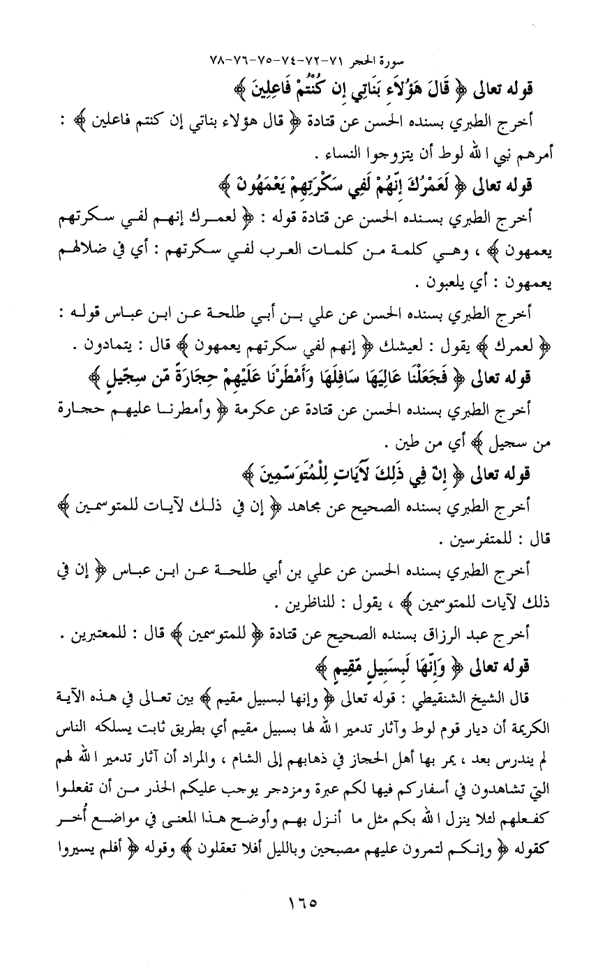 قال الشيخ الشنقيطي، قوله تعالى (وإنها لبسبيل مقيم) بين تعالى في هذه الآية الكريمة أن ديار قوم لوط وآثار تدمير الله لها بسبيل مقيم أي بطريق ثابت يسلكه الناس لم يندرس بعد، يمر بها أهل الحجاز في ذهابهم إلى الشام، والمراد أن آثار تدمير الله لهم التي تشاهدون في أسفاركم فيها لكم عبرة ومزدجر يوجب عليكم الحذر من أن تفعلوا كفعلهم لئلا ينزل الله لكم مثل ما أنزل بهم وأوضح هذا المعنى في مواضع أخر كقوله (وإنكم لترون عليهم مصبحين وبالليل أفلا تعقلون) وقوله (أفلم يسيروا