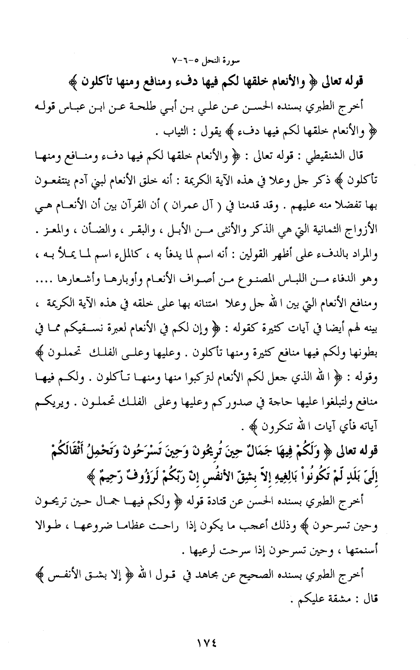 قوله تعالى (وَلَكُمْ فِيهَا جَمَالٌ حِينَ تُرِيحُونَ وَحِينَ تَسْرَحُونَ (6) وَتَحْمِلُ أَثْقَالَكُمْ إِلَى بَلَدٍ لَمْ تَكُونُوا بَالِغِيهِ إِلَّا بِشِقِّ الْأَنْفُسِ إِنَّ رَبَّكُمْ لَرَءُوفٌ رَحِيمٌ)