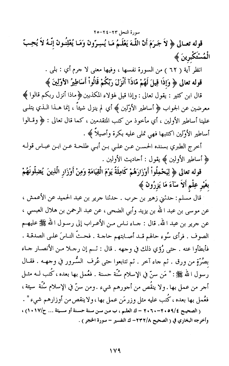(الصحيح 4/2059-2060- ك العلم، ب من سن سنة حسنة أو سيئة ... ح/1017) ، وأخرجه البخاري في (الصحيح 8/232- ك التفسير- سورة الحجر) .