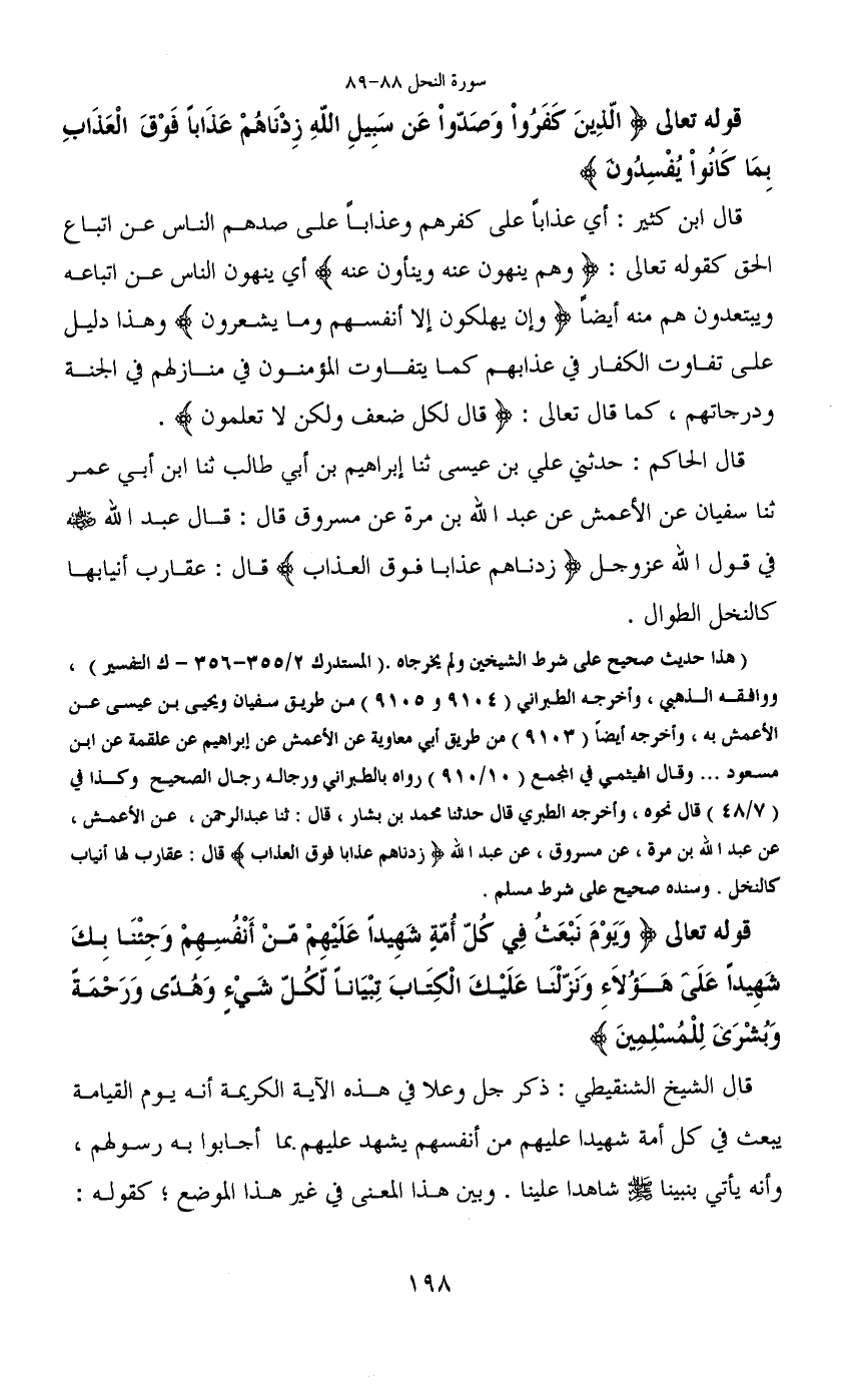 قوله تعالى (وَيَوْمَ نَبْعَثُ فِي كُلِّ أُمَّةٍ شَهِيدًا عَلَيْهِمْ مِنْ أَنْفُسِهِمْ وَجِئْنَا بِكَ شَهِيدًا عَلَى هَؤُلَاءِ وَنَزَّلْنَا عَلَيْكَ الْكِتَابَ تِبْيَانًا لِكُلِّ شَيْءٍ وَهُدًى وَرَحْمَةً وَبُشْرَى لِلْمُسْلِمِينَ)