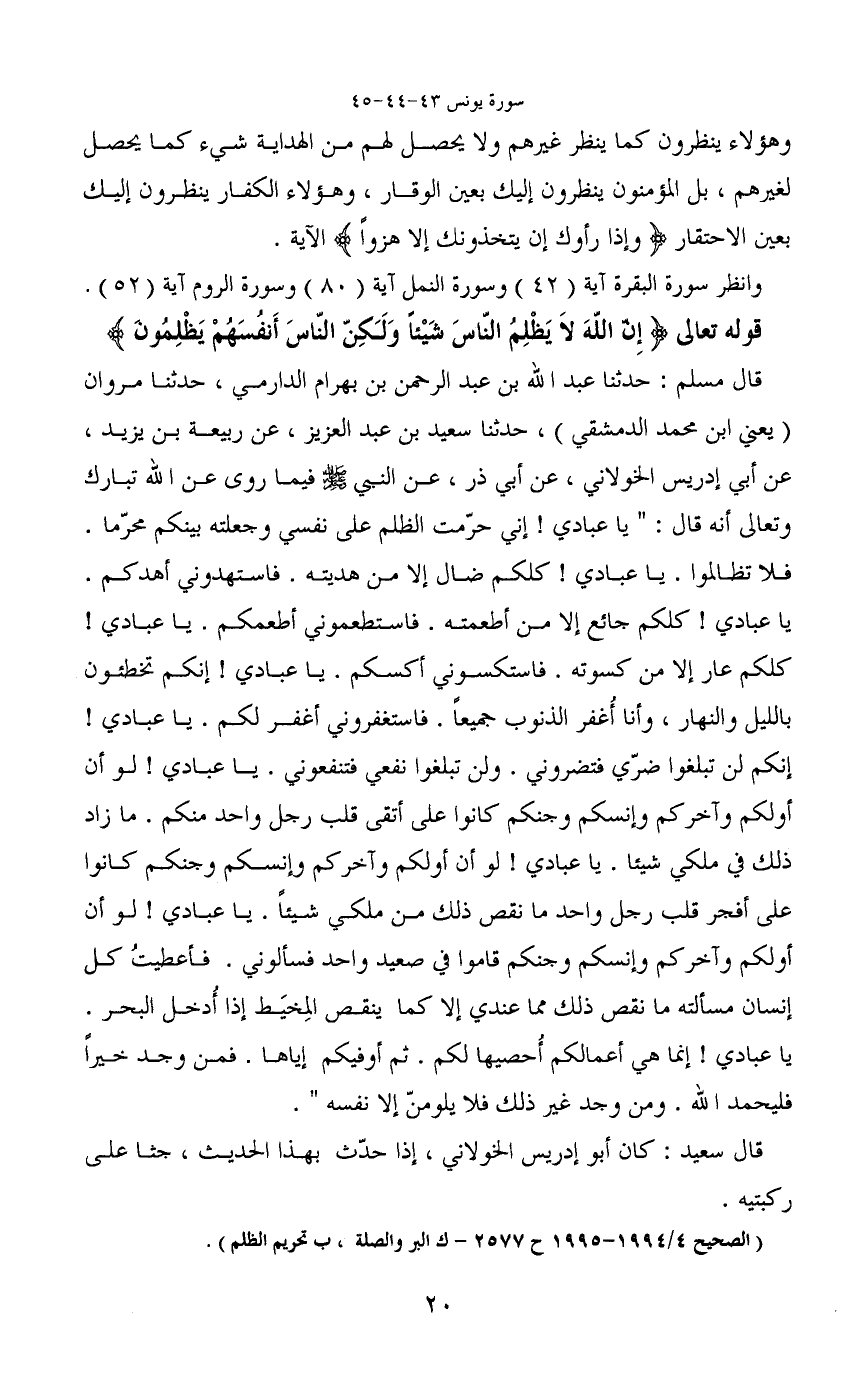 قال مسلم: حدثنا عبد الله بن عبد الرحمن بن بهرام الدارمي، حدثنا مروان (يعني ابن محمد الدمشقي) ، حدثنا سعيد بن عبد العزيز، عن ربيعة بن يزيد، عن أبي إدريس الخولاني، عن أبي ذر، عن النبي - صَلَّى اللَّهُ عَلَيْهِ وَسَلَّمَ - فيما روى عن الله تبارك وتعالى أنه قال: "يا عبادي! إني حرمت الظلم على نفسي وجعلته بينكم محرّما. فلا تظالموا. يا عبادي! كلكم ضال إلا من هديته. فاستهدوني أهدكم. يا عبادى! كلكم جائع إلا من أطعمته. فاستطعموني أطعمكم. يا عبادي! كلكم عار إلا من كسوته. فاستكسوني أكسكم. يا عبادي! إنكم تخطئون بالليل والنهار، وأنا أغفر الذنوب جميعا. فاستغفروني أغفر لكم. يا عبادي! إنكم لن تبلغوا ضرّي فتضروني. ولن تبلغوا نفعي فتنفعوني. يا عبادي! لو أن أولكم وأخركم وإنسكم وجنكم كانوا على أتقى قلب رجل واحد منكم. ما زاد ذلك في ملكي شيئاً. يا عبادي! لو أن أولكم وأخركم وإنسكم وجنكم كانوا على أفجر قلب رجل واحد ما نقص ذلك من ملكي شيئاً. يا عبادي! لو أن أولكم وأخركم وإنسكم وجنكم قاموا في صعيد واحد فسألوني. فأعطيتُ كل إنسان مسألته ما نقص ذلك مما عندي إلا كما ينقص المِخيَط إذا أدخل البحر. يا عبادي! إنما هي أعمالكم أحصيها لكم. ثم أوفيكم إياها. فمن وجد خيرا فليحمد الله. ومن وجد غير ذلك فلا يلومنّ إلا نفسه".