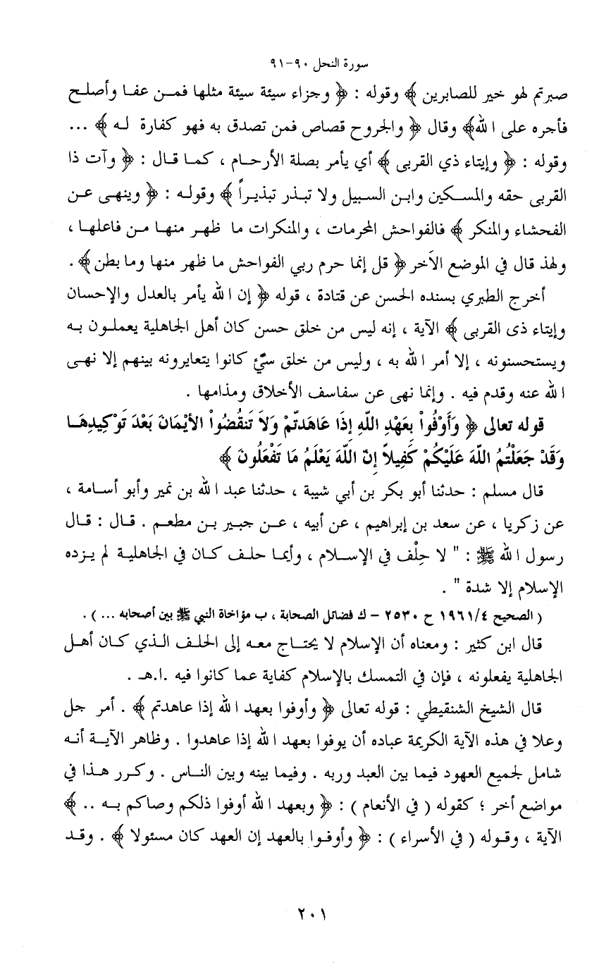 قوله تعالى (وَأَوْفُوا بِعَهْدِ اللَّهِ إِذَا عَاهَدْتُمْ وَلَا تَنْقُضُوا الْأَيْمَانَ بَعْدَ تَوْكِيدِهَا وَقَدْ جَعَلْتُمُ اللَّهَ عَلَيْكُمْ كَفِيلًا إِنَّ اللَّهَ يَعْلَمُ مَا تَفْعَلُونَ)