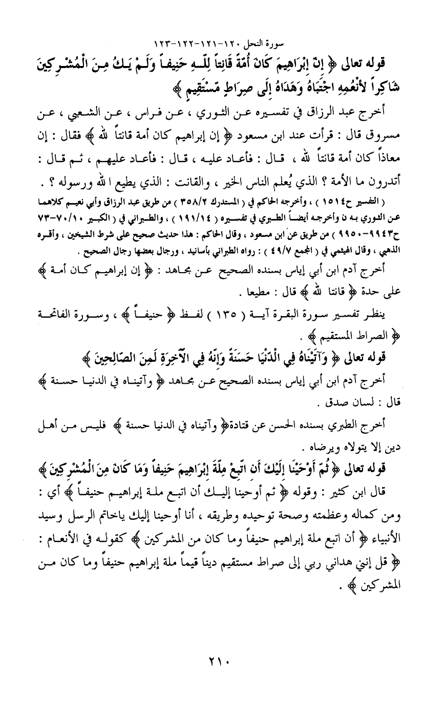 قوله تعالى (إِنَّ إِبْرَاهِيمَ كَانَ أُمَّةً قَانِتًا لِلَّهِ حَنِيفًا وَلَمْ يَكُ مِنَ الْمُشْرِكِينَ (120) شَاكِرًا لِأَنْعُمِهِ اجْتَبَاهُ وَهَدَاهُ إِلَى صِرَاطٍ مُسْتَقِيمٍ)
