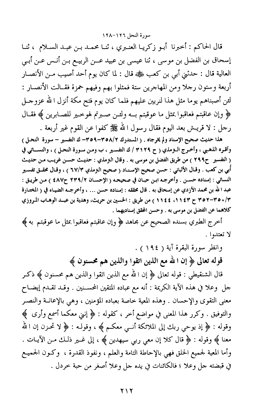 هذا حديث صحيح الإسناد ولم يخرجاه. (المستدرك 2/358-359- ك التفسير- سورة النحل) وأقره الذهبي، وأخرج الترمذي (ح 3129/ك التفسير، ب ومن سورة النحل) ، والنسائي في (التفسير ح 299) من طريق الفضل بن موسى به. وقال الترمذي: حديث حسن غريب من حديث أُبي بن كعب. وقال الألباني: حسن صحيح الإسناد (صحيح الترمذي 3/67) ، وقال محقق تفسير النسائي: إسناده حسن. وأخرجه ابن حبان في صحيحه (الإحسان 2/239 ح 487) من طريق: عبد الله بن محمد الأزدي عن إسحاق به. قال محققه: إسناده حسن ... ، وأخرجه الضياء في (المختارة 3/350-352 ح 1143، 1144) من طريق: الحسين بن حريث، وهدية بن عبد الوهاب المروزي كلاهما عن الفضل بن موسى به. وحسن المحقق إسناديهما.