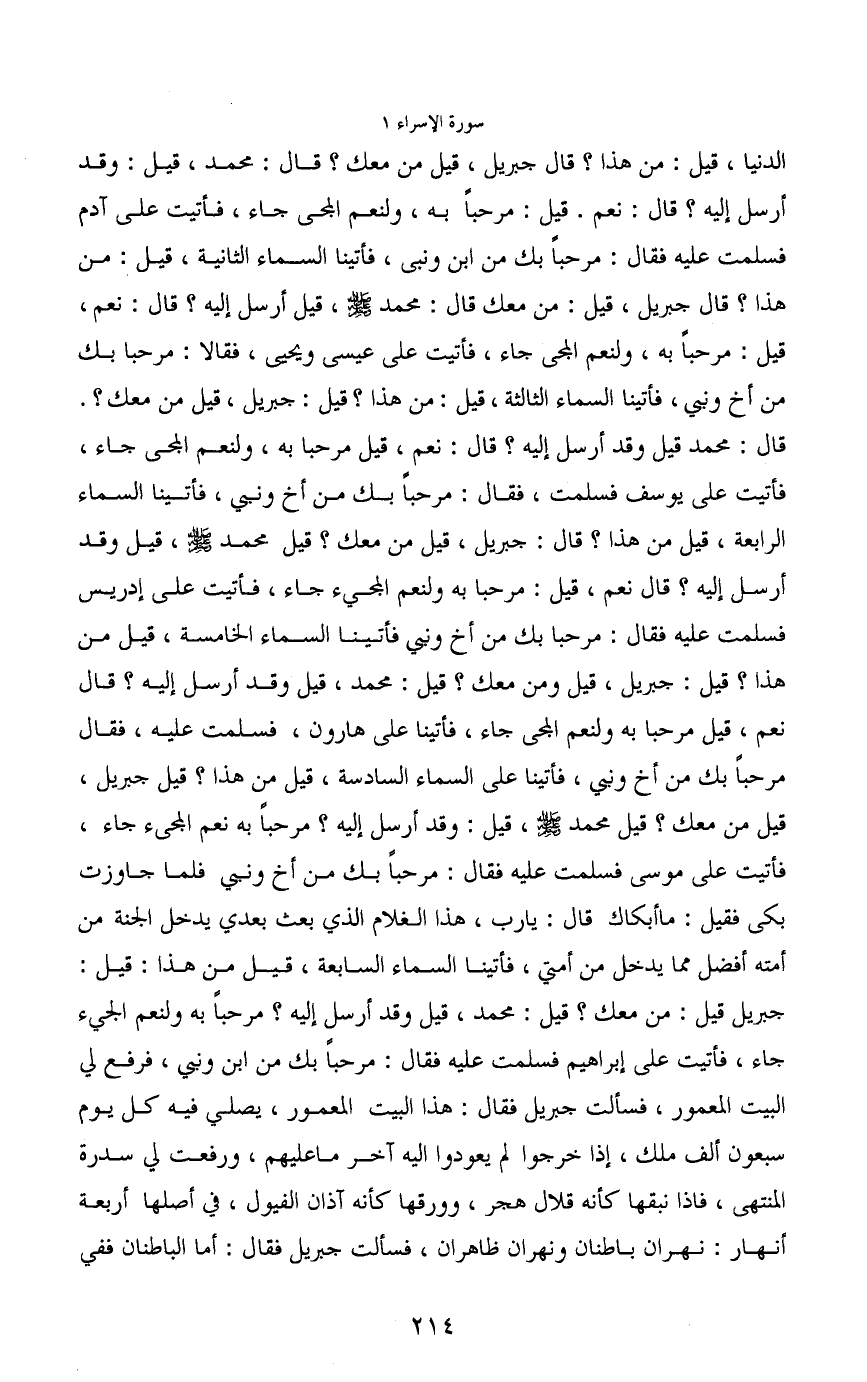 الدنيا، قيل: من هذا؟ قال جبريل، قيل من معك؟ قال: محمد، قيل: وقد أرسل إليه؟ قال: نعم. قيل: مرحباً به، ولنعم المجى جاء، فأتيت على آدم فسلمت عليه فقال: مرحباً بك من ابن ونبي، فأتينا السماء الثانية، قيل: من هذا؟ قال جبريل، قيل: من معك قال: محمد - صَلَّى اللَّهُ عَلَيْهِ وَسَلَّمَ -، قيل أرسل إليه؟ قال: نعم، قيل: مرحباً به، ولنعم المجى جاء، فأتيت على عيسى ويحيى، فقالا: مرحباً بك من أخ ونبي، فأتينا السماء الثالثة، قيل: من هذا؟ قيل: جبريل، قيل من معك؟. قال: محمد قيل وقد أرسل إليه؟ قال: نعم، قيل مرحباً به، ولنعم المجى جاء، فأتيت على يوسف فسلمت، فقال: مرحباً بك من أخ ونبي، فأتينا السماء الرابعة، قيل من هذا؟ قال: جبريل، قيل من معك؟ قيل محمد - صَلَّى اللَّهُ عَلَيْهِ وَسَلَّمَ -، قيل وقد أرسل إليه؟ قال نعم، قيل: مرحباً به ولنعم المجيء جاء، فأتيت على إدريس فسلمت عليه فقال: مرحباً بك من أخ ونبي فأتينا السماء الخامسة، قيل من هذا؟ قيل: جبريل، قيل ومن معك؟ قيل: محمد، قيل وقد أرسل إليه؟ قال نعم، قيل مرحباً به ولنعم المجى جاء، فأتينا على هارون، فسلمت عليه، فقال مرحباً بك من أخ ونبي، فأتينا على السماء السادسة، قيل من هذا؟ قيل جبريل، قيل من معك؟ قيل محمد - صَلَّى اللَّهُ عَلَيْهِ وَسَلَّمَ -، قيل: وقد أرسل إليه؟ مرحباً به نعم المجىء جاء، فأتيت على موسى فسلمت عليه فقال: مرحباً بك من أخ ونبي فلما جاوزت بكى فقيل: ما أبكاك قال: يارب، هذا الغلام الذي بعث بعدي يدخل الجنة من أمته أفضل مما يدخل من أمتي، فأتينا السماء السابعة، قيل من هذا: قيل: جبريل قيل: من معك؟ قيل: محمد، قيل وقد أرسل إليه؟ مرحباً به ولنعم الجيء جاء، فأتيت على إبراهيم فسلمت عليه فقال: مرحباً بك من ابن ونبي، فرفع في البيت المعمور، فسألت جبريل فقال: هذا البيت المعمور، يصلى فيه كل يوم سبعون ألف ملك، إذا خرجوا لم يعودوا إليه آخر ماعليهم، ورفعت لي سدرة المنتهى، فاذا نبقها كأنه قلال هجر، وورقها كأنه آذان الفيول، في أصلها أربعة أنهار: نهران باطنان ونهران ظاهران، فسألت جبريل فقال: أما الباطنان ففي