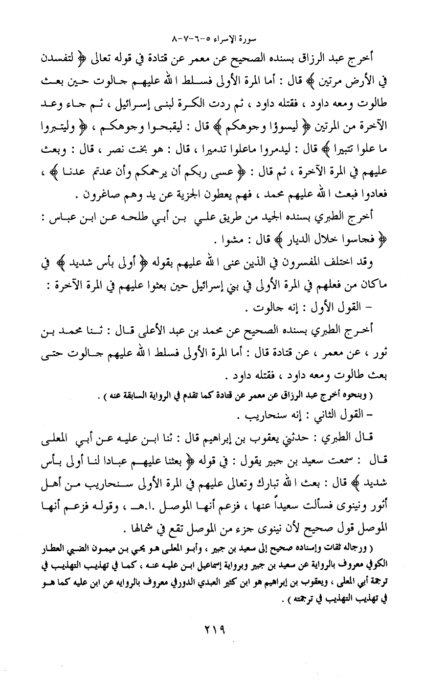 أخرج عبد الرزاق بسنده الصحيح عن معمر عن قتادة في قوله تعالى (لتفسدن في الأرض مرتين) قال: أما المرة الأولى فسلط الله عليهم جالوت حين بعث طالوت ومعه داود، فقتله داود، ثم ردت الكرة لبنى إسرائيل، ثم جاء وعد الآخرة من المرتين (ليسوؤا وجوهكم) قال: ليقبحوا وجوهكم، (وليتبروا ما علوا تتبيرا) قال: ليدمروا ماعلوا تدميرا، قال: هو بخت نصر، قال: وبعث عليهم في المرة الآخرة، ثم قال: (عسى ربكم أن يرحمكم وأن عدتم عدنا) ، فعادوا فبعث الله عليهم محمد، فهم يعطون الجزية عن يد وهم صاغرون.