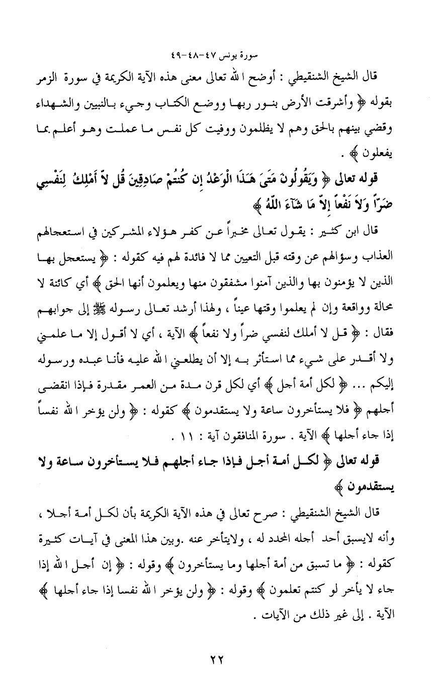 قال ابن كثير: يقول تعالى مخبراً عن كفر هؤلاء المشركين في استعجالهم العذاب وسؤالهم عن وقته قبل التعيين مما لا فائدة لهم فيه كقوله: (يستعجل بها الذين لا يؤمنون بها والذين آمنوا مشفقون منها ويعلمون أنها الحق) أي كائنة لا محالة وواقعة وإن لم يعلموا وقتها عينا، ولهذا أرشد تعالى رسوله - صَلَّى اللَّهُ عَلَيْهِ وَسَلَّمَ - إلى جوابهم فقال: (قل لا أملك لنفسي ضراً ولا نفعا) الآية، أي لا أقول إلا ما علمني ولا أقدر على شيء مما استأثر به إلا أن يطلعني الله عليه فأنا عبده ورسوله إليكم ... (لكل أمة أجل) أي لكل قرن مدة من العمر مقدرة فإذا انقضى أجلهم (فلا يستأخرون ساعة ولا يستقدمون) كقوله: (ولن يؤخر الله نفسا إذا جاء أجلها) الآية. سورة المنافقون آية: 11.