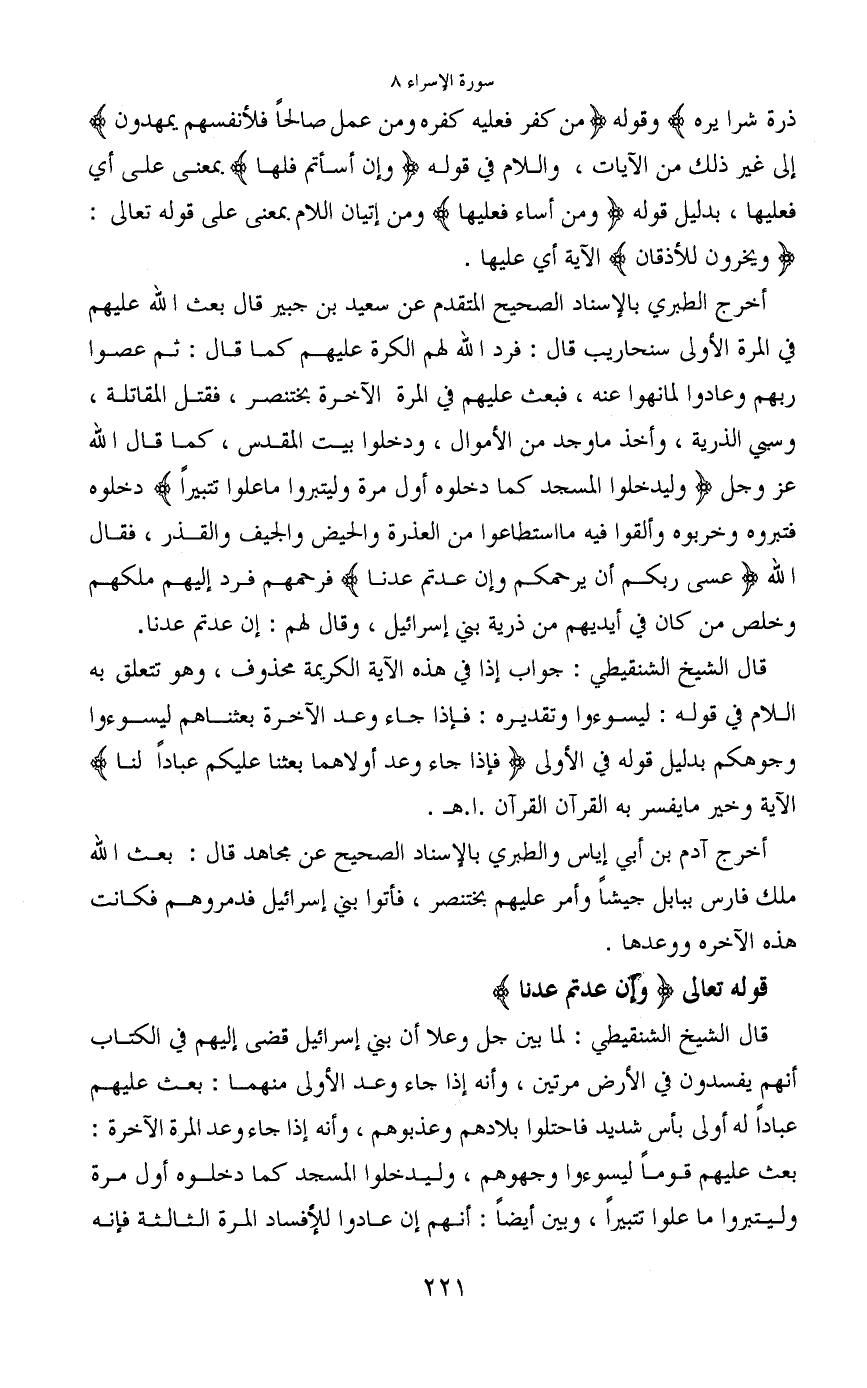 قال الشيخ الشنقيطي: لما بين جل وعلا أن بني إسرائيل قضى إليهم في الكتاب أنهم يفسدون في الأرض مرتين، وأنه إذا جاء وعد الأولى منهما: بعث عليهم عباداً له أولى بأس شديد فاحتلوا بلادهم وعذبوهم، وأنه إذا جاء وعد المرة الآخرة: بعث عليهم قوما ليسوءوا وجهوهم، وليدخلوا المسجد كما دخلوه أول مرة وليتبروا ما علوا تتبيرا، وبين أيضاً: أنهم إن عادوا للإفساد المرة الثالثة فإنه
